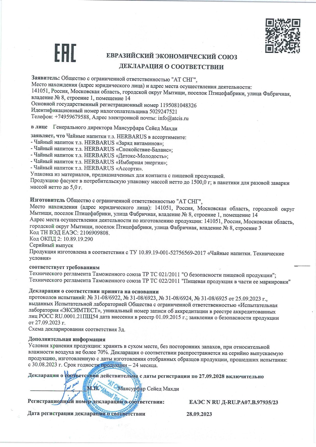Чай HERBARUS "Заряд витаминов" травяной, 24 пакетика в конвертах по 1,8 г