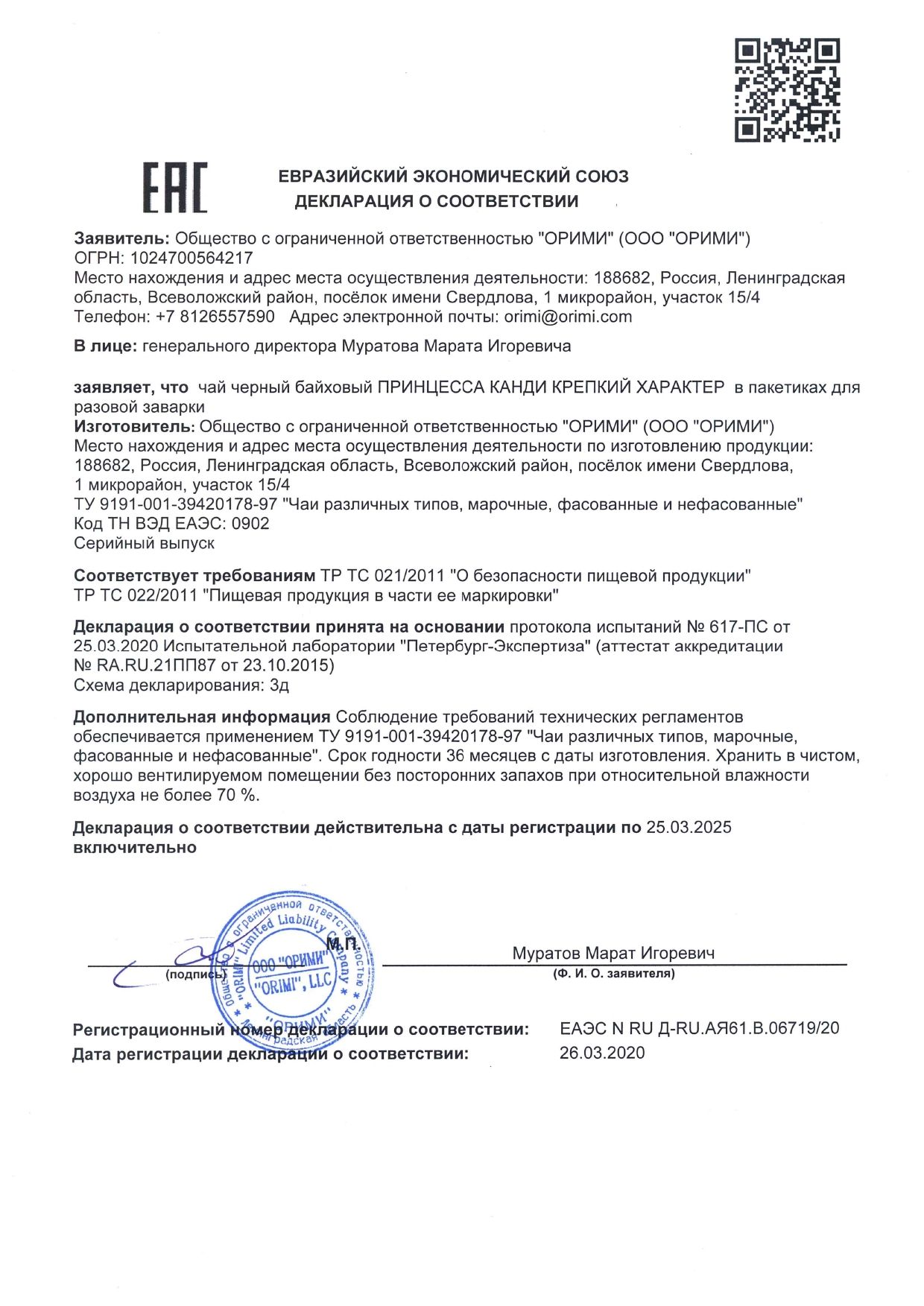 Чай ПРИНЦЕССА КАНДИ "Крепкий Характер" черный, 100 пакетиков по 2 г, 1630-18