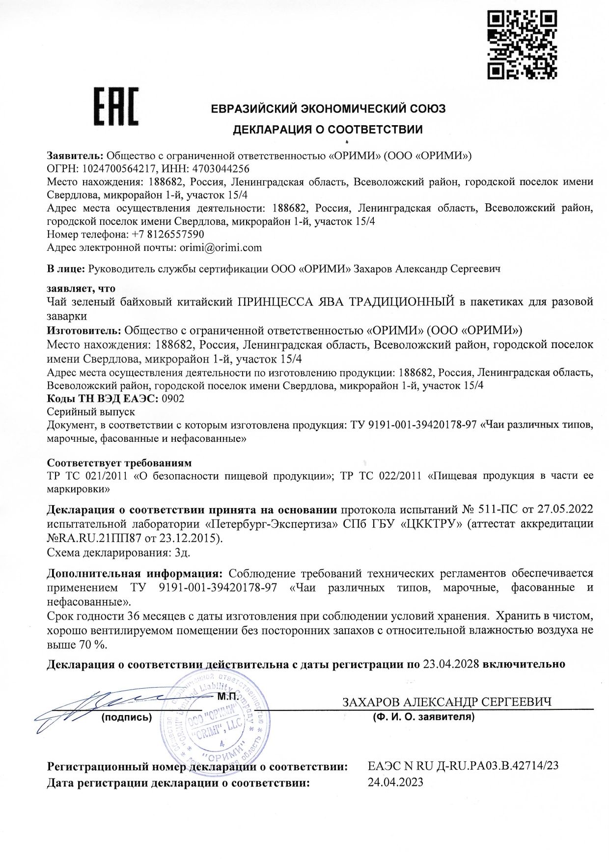 Чай ПРИНЦЕССА ЯВА зеленый, 100 пакетиков по 2 г, 0880-18