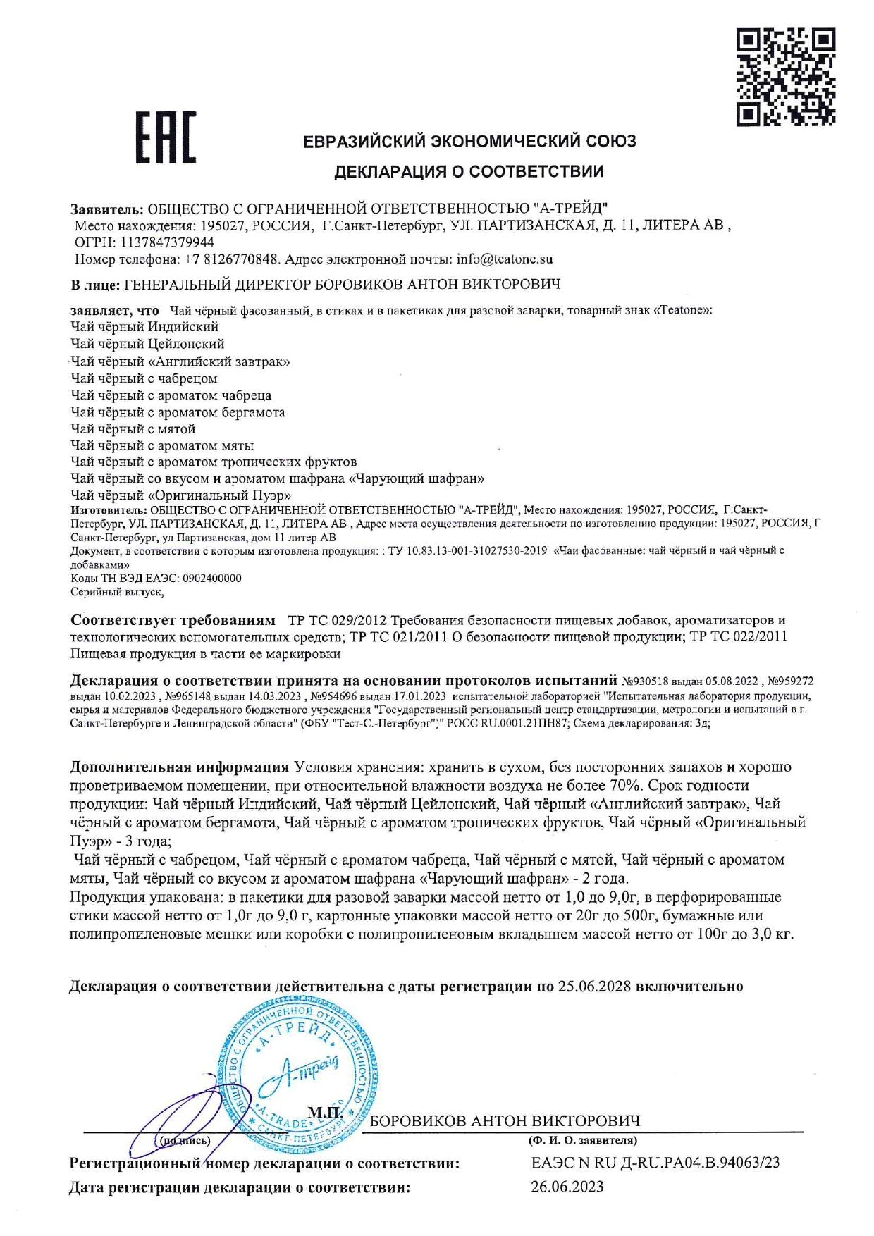 Состав: чай чёрный байховый мелкий, ароматизатор пищевой «бергамот». Место произрастания чайного листа – Индия.