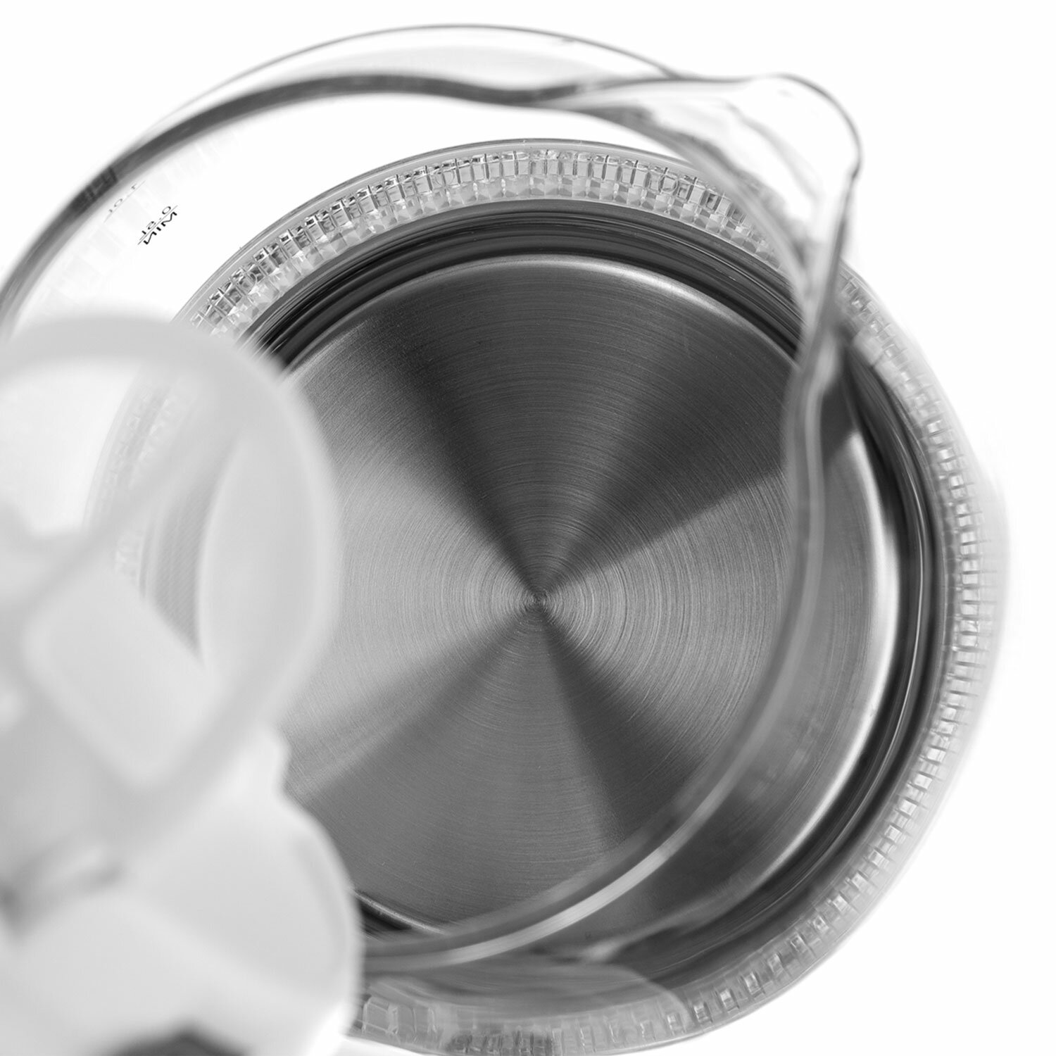 Объем чайника составляет 1,8 л, что делает его идеальным для семьи или большой компании. Благодаря мощности 2200 Вт чайник вскипятит воду за считанные минуты. Скрытый нагревательный элемент обеспечит безопасность при использовании. За счет быстрого закипания чайник экономит электроэнергию. Корпус выполнен из высококачественного стекла. Кипячение воды сопровождается стильной синей подсветкой. В чайник встроен моющийся съемный фильтр для того, чтобы накипь не попадала в чашку. При отсутствии воды чайник автоматически отключается, предотвращая возгорание.