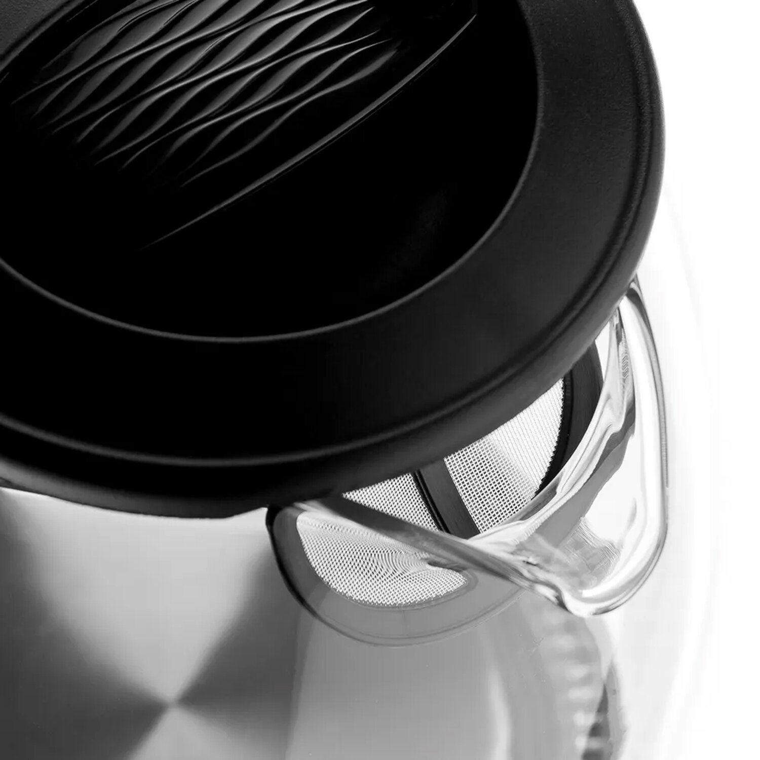 Корпус изготовлен из высокопрочного термостойкого стекла. При включении чайника загорается подсветка, которая является индикатором работы и красиво подсвечивает кипящую воду. Для защиты от накипи в носик встроен фильтр.