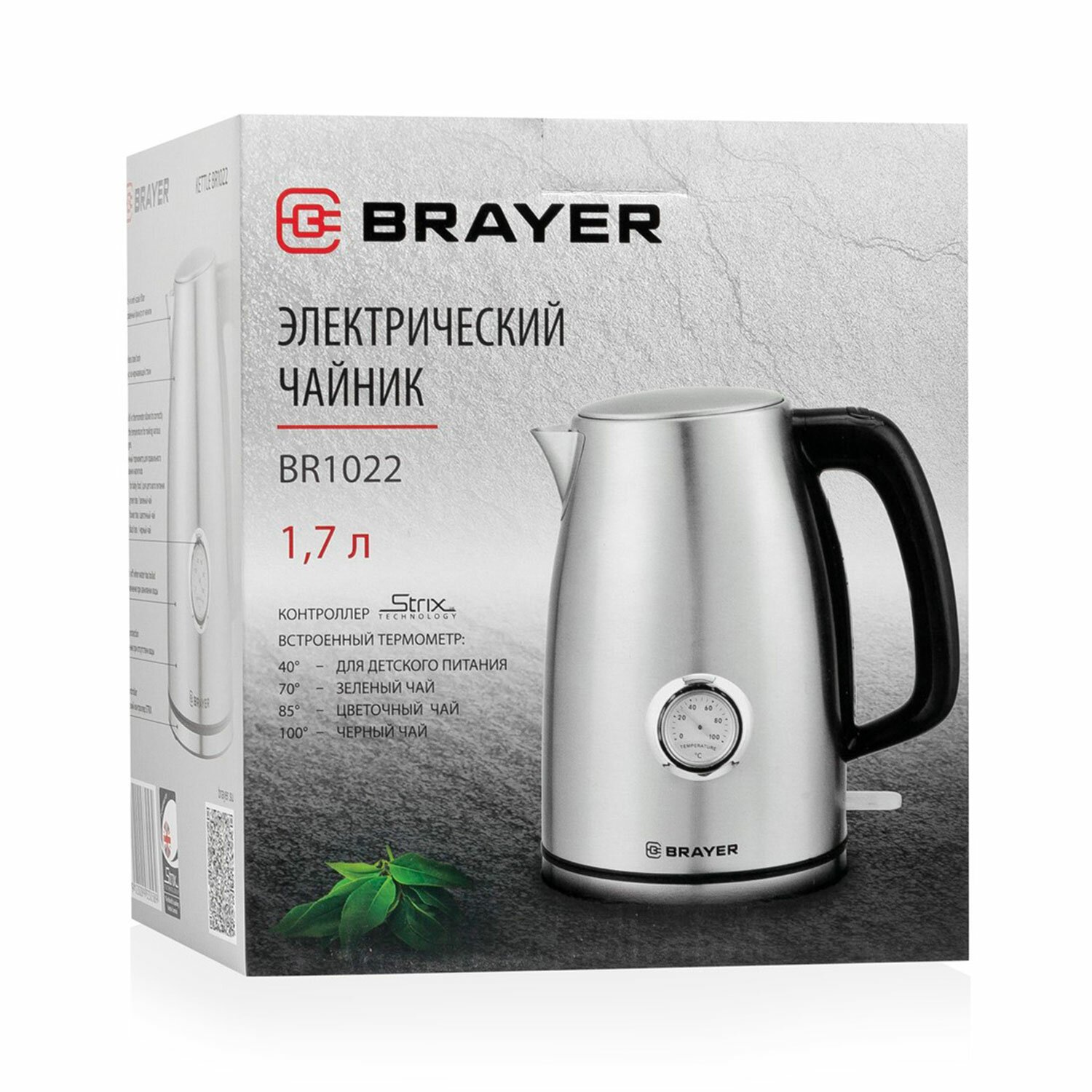 Чайник с термометром BRAYER BR1022, 1,8 л, 2200 Вт, закрытый нагревательный элемент, сталь
