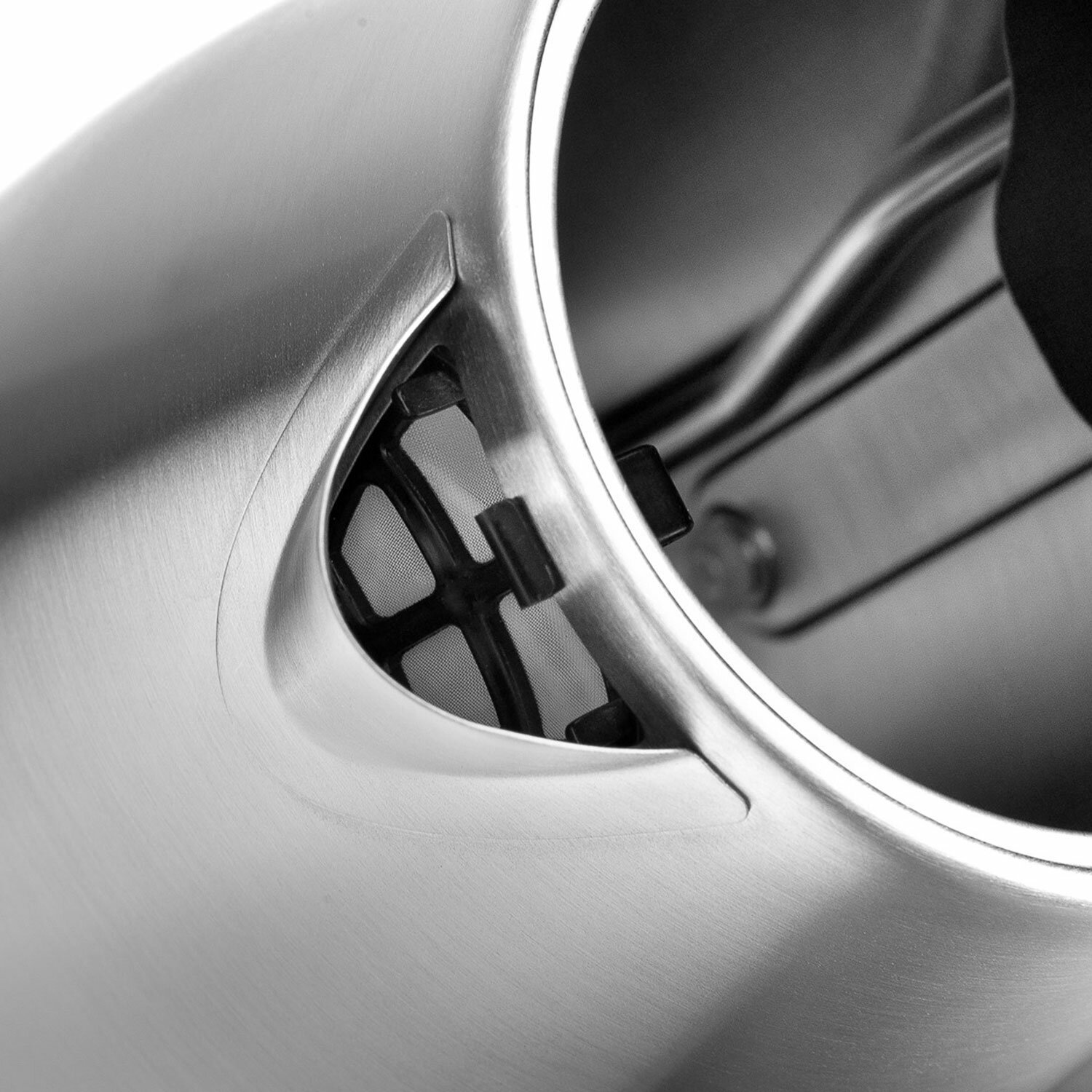 С помощью термометра можно контролировать температуру воды в чайнике, чтобы нагреть воду для определенного сорта чая. Корпус изготовлен из прочной нержавеющей стали и дополнен индикатором уровня воды. Для защиты от накипи в носик встроен фильтр.