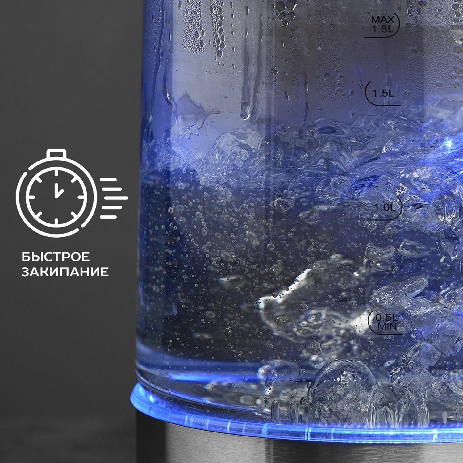 Чайник KITFORT КТ-641, 1,8 л, 2200 Вт, закрытый нагревательный элемент, стекло, серебристый