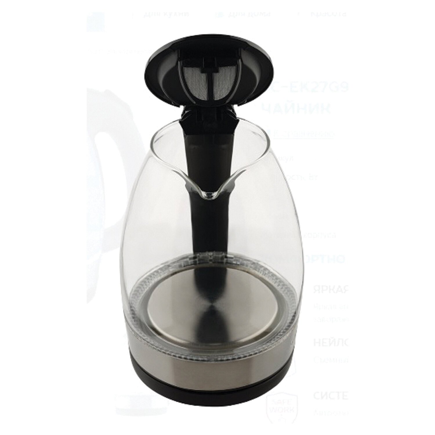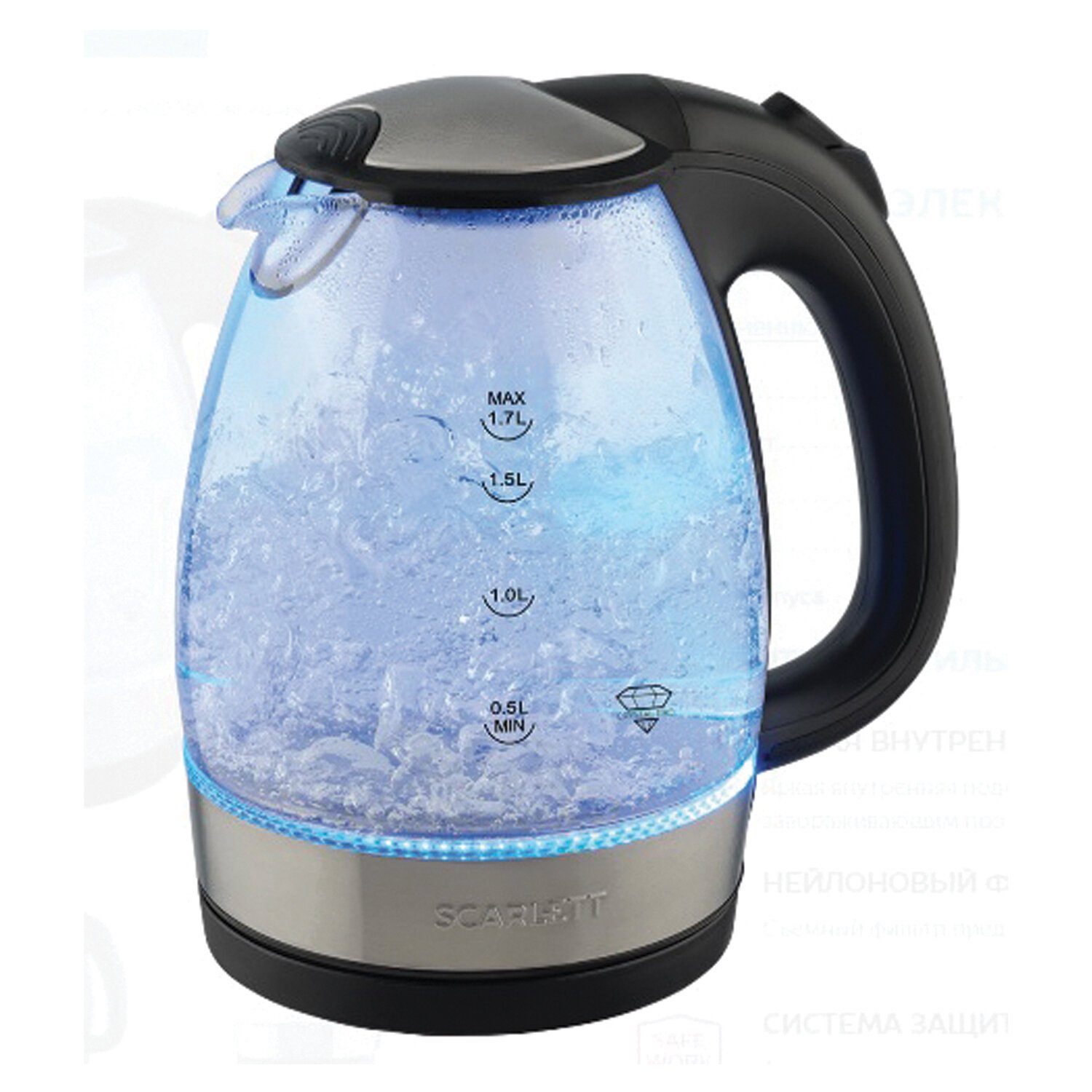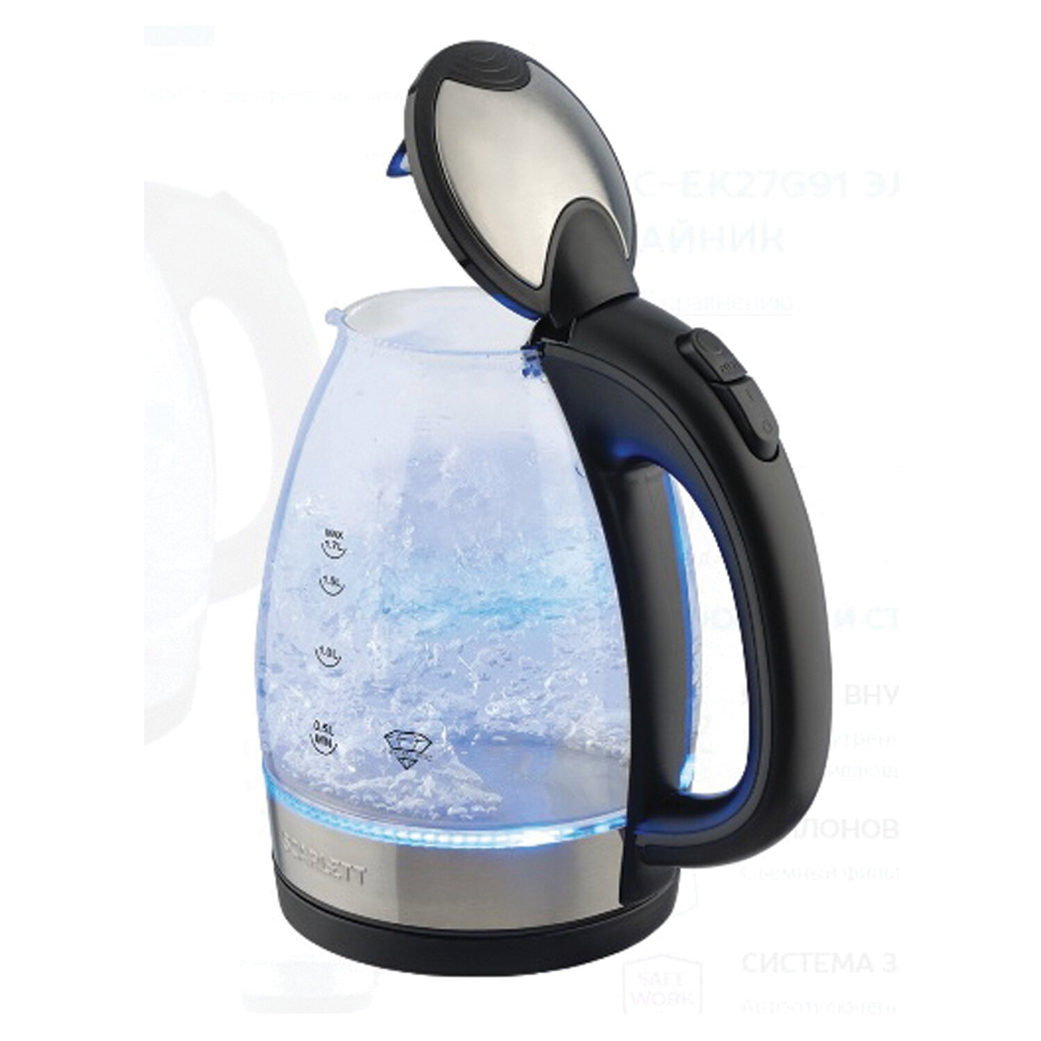Электрический чайник SCARLETT SC-EK27G91 объемом 1,7 л оснащён автоматической системой открытия крышки.