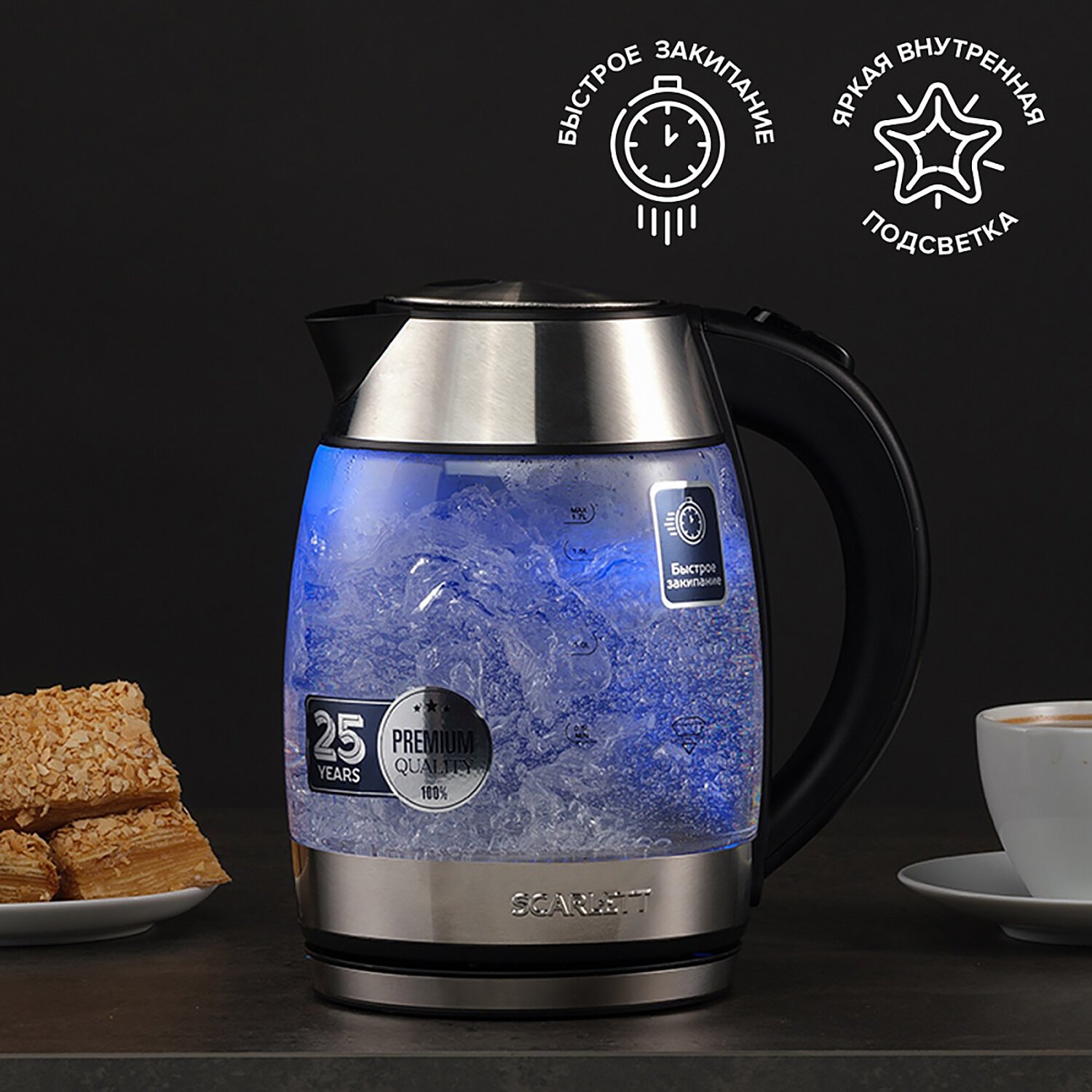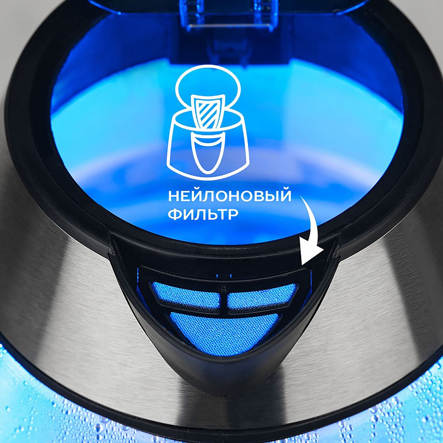 При включении чайника загорается подсветка, которая является индикатором работы и художественно подсвечивает кипящую воду.