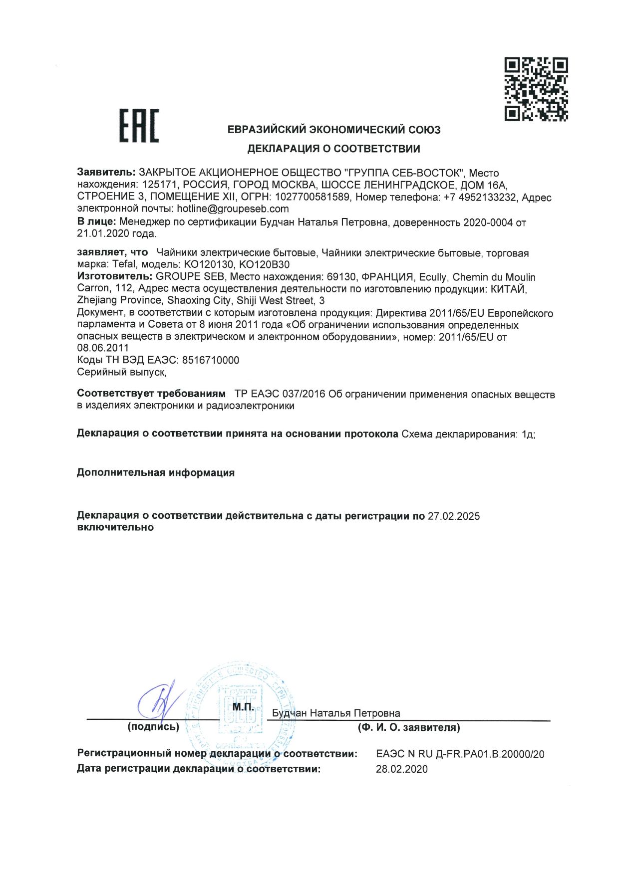 Чайник TEFAL KO120B30, 0,5 л, 650 Вт, закрытый нагревательный элемент, пластик, серый, 7211001545