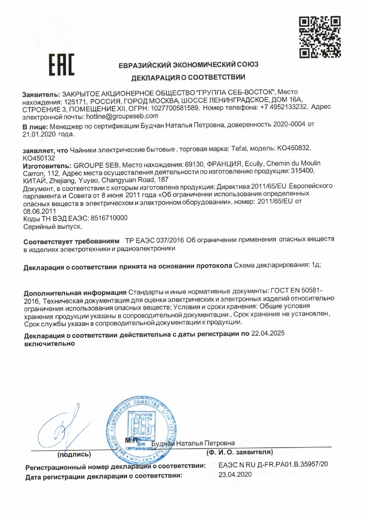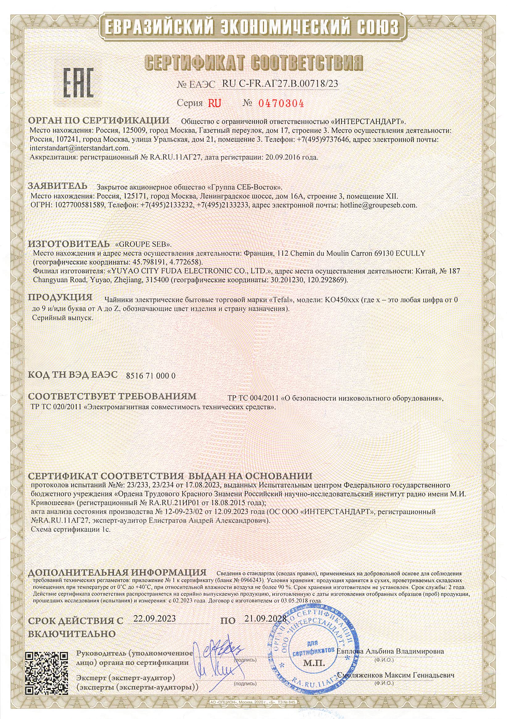 Чайник TEFAL KO450832, 1,7 л, 2400 Вт, закрытый нагревательный элемент, стекло, черный