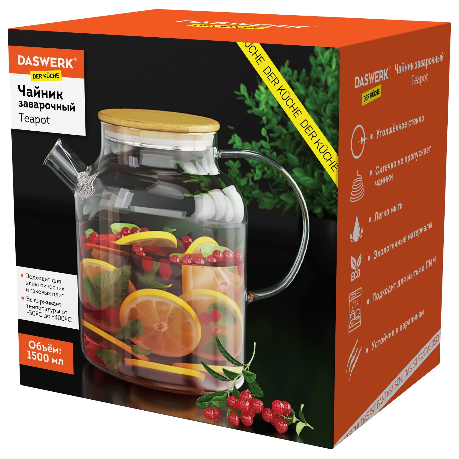 Заварочный чайник изготовлен из утолщенного жаропрочного стекла. Устойчив к царапинам и помутнениям. Выдерживает перепады температур от -30 до +400 градусов по Цельсию. Подходит для электрических и газовых плит. Можно мыть в посудомоечной машине.