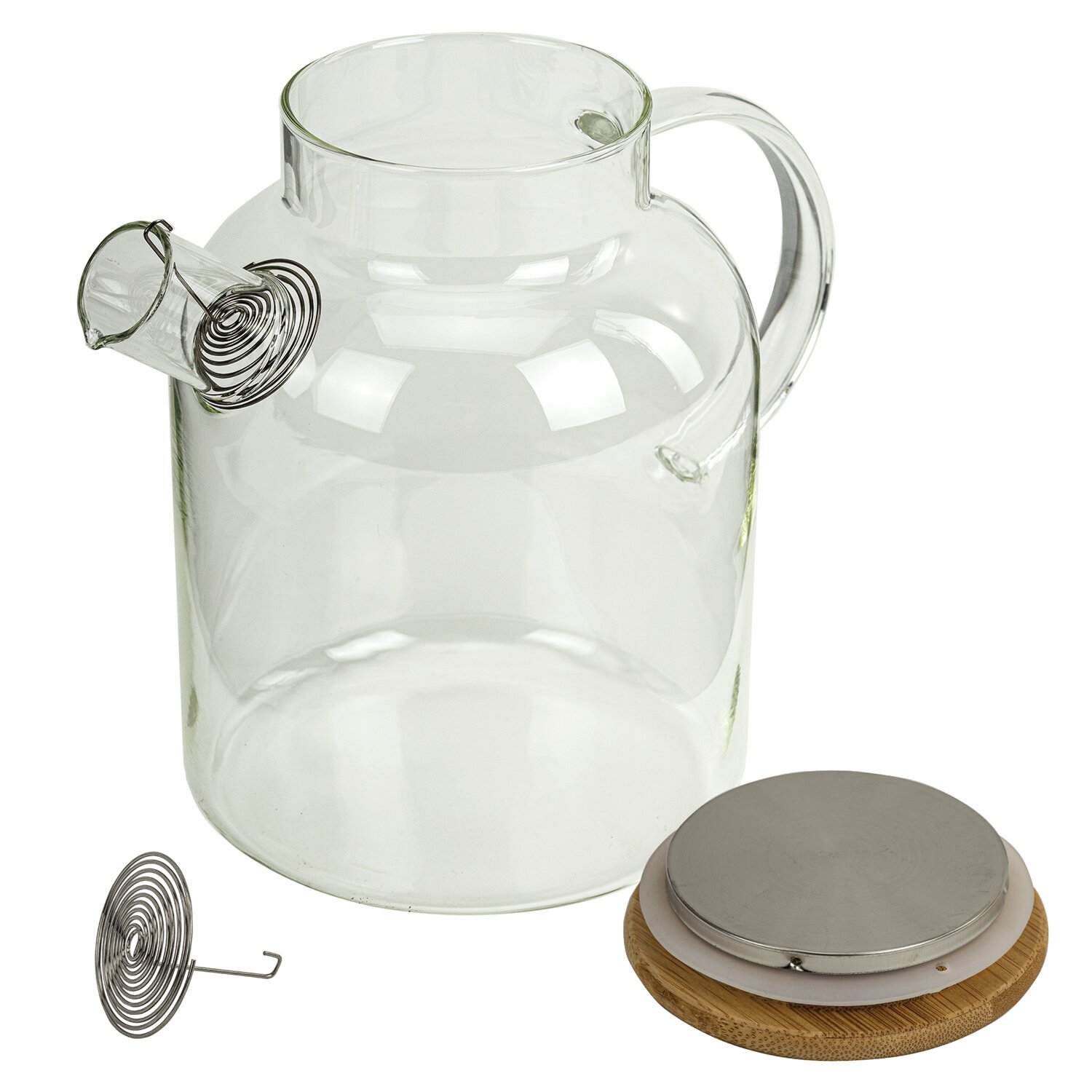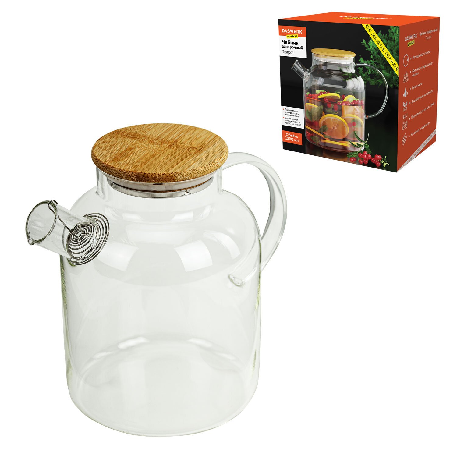 Чайник заварочный 1500 мл "Бочонок", жаропрочное стекло, спиральное сито, DASWERK, 608645
