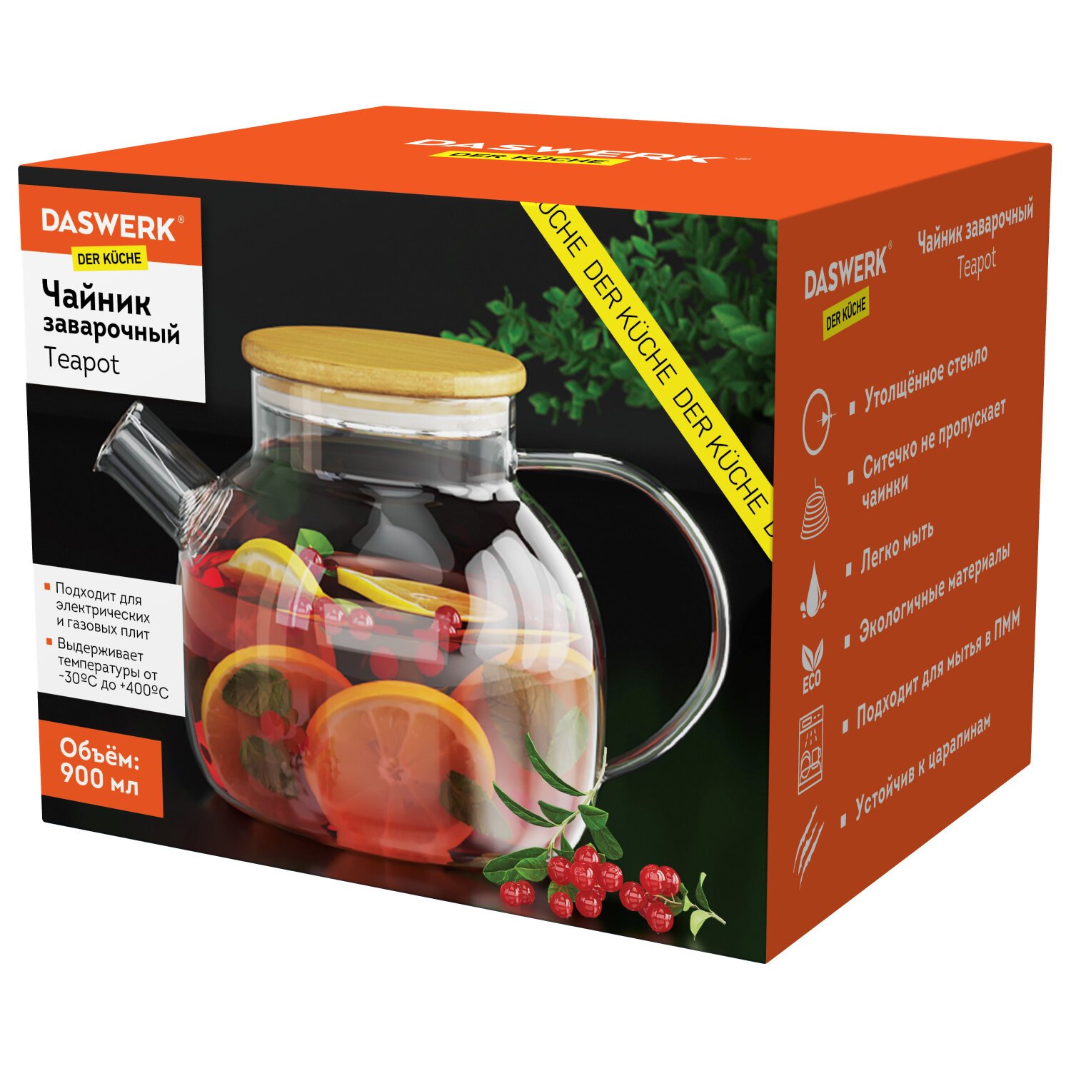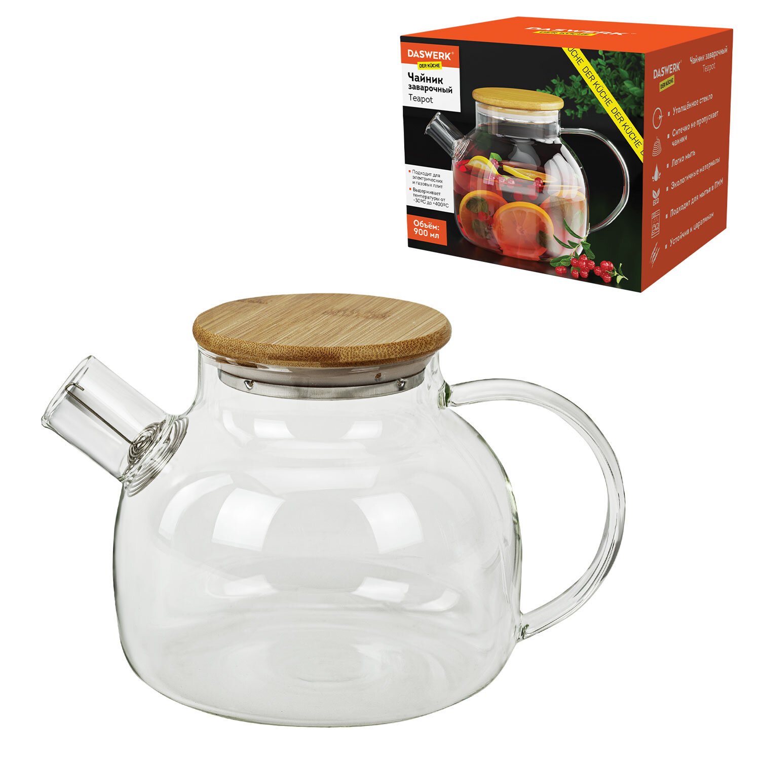 Чайник заварочный 900 мл "Бочонок", жаропрочное стекло, спиральное сито, DASWERK, 608644