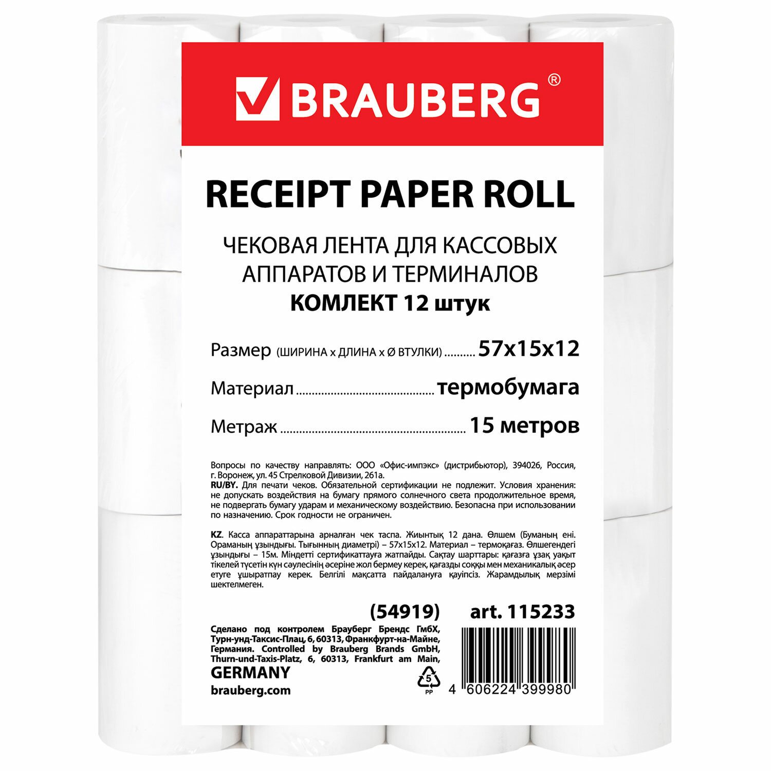 Чековая лента ТЕРМОБУМАГА 57 мм (диаметр 33 мм, длина 15 м, втулка 12 мм) КОМПЛЕКТ 12 шт., BRAUBERG, 115233