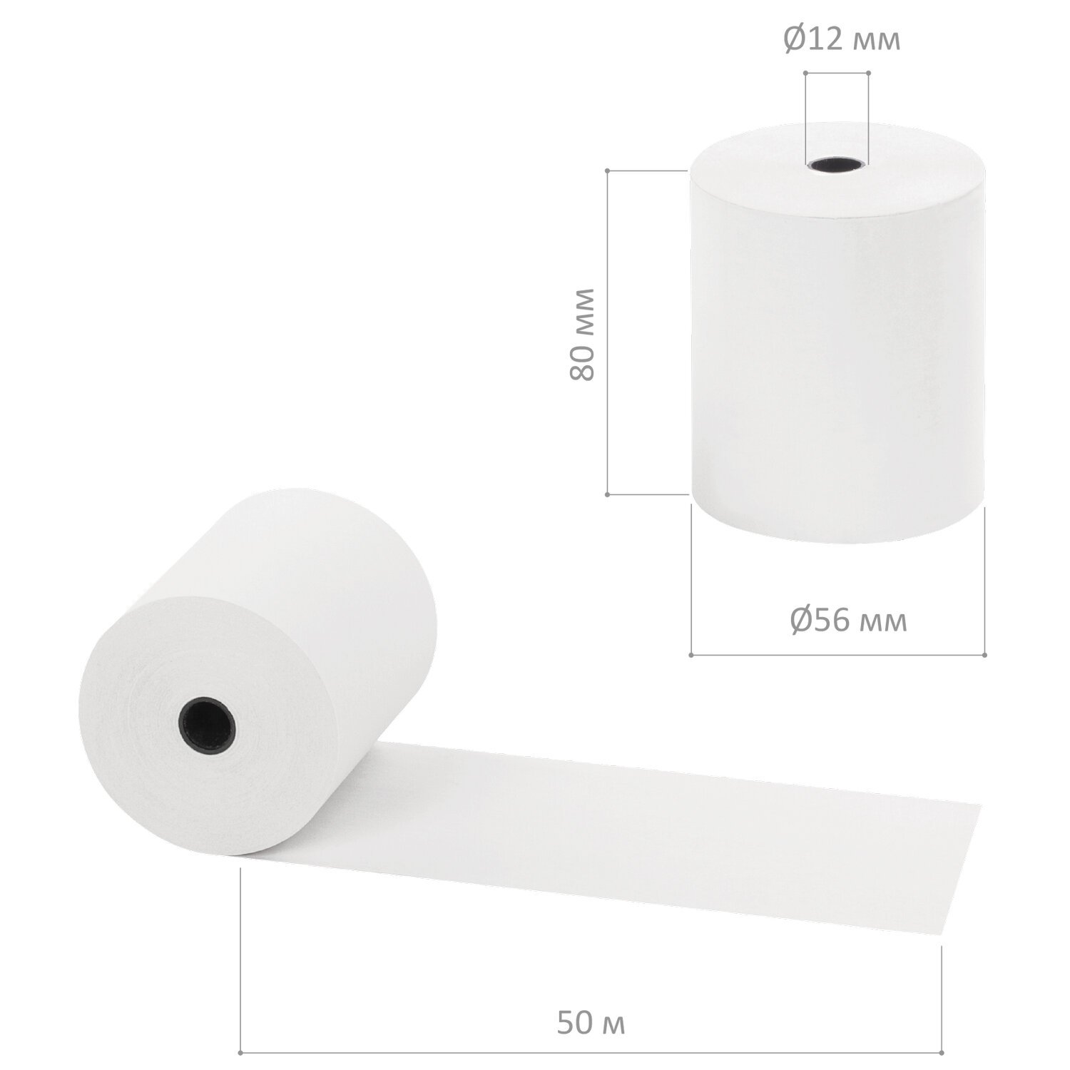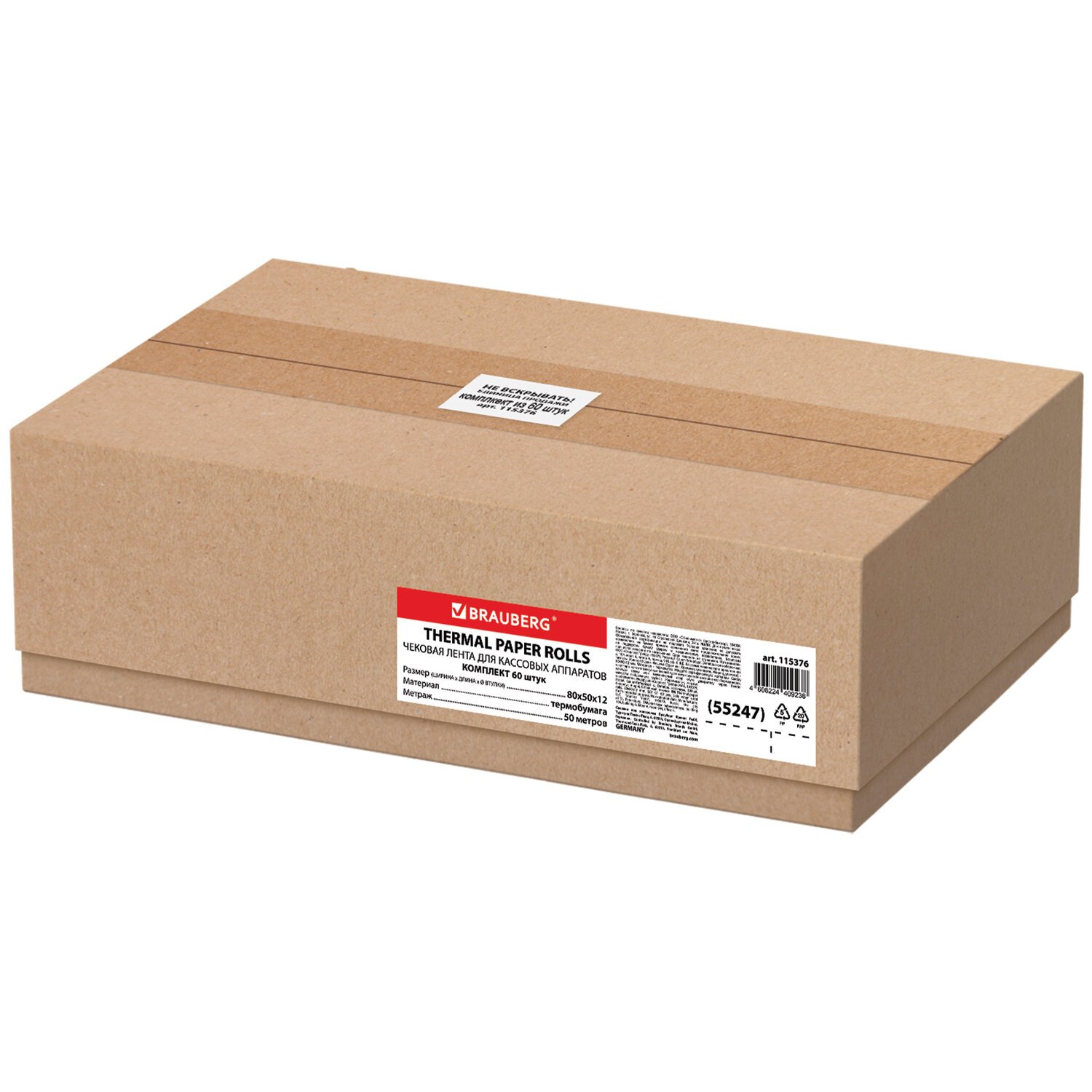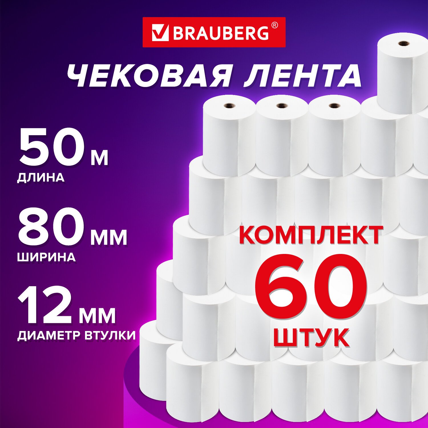 Чековая лента ТЕРМОБУМАГА 80 мм (диаметр 60 мм, длина 50 м, втулка 12 мм) КОМПЛЕКТ 60 шт., BRAUBERG, 115376