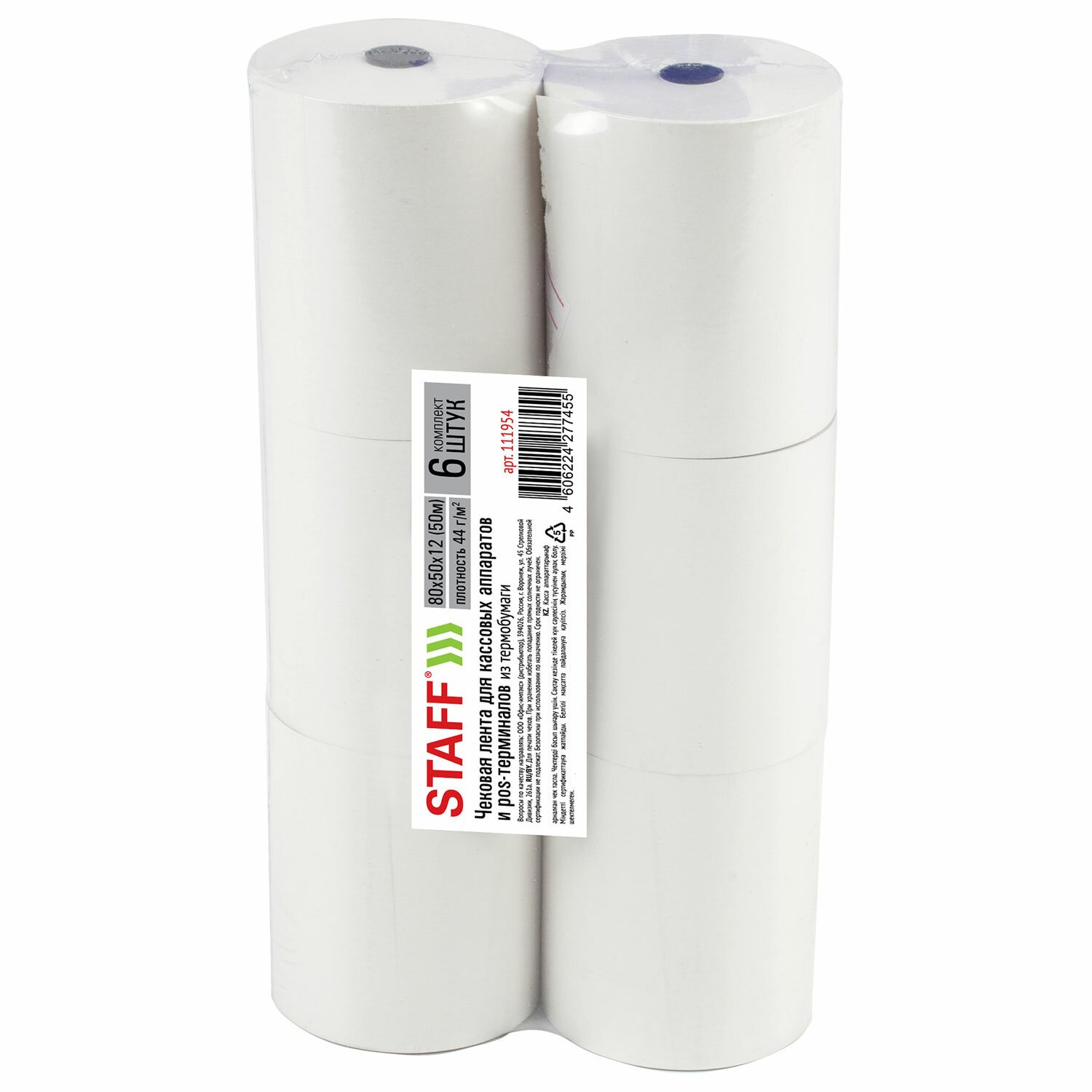 Чековая лента ТЕРМОБУМАГА 80 мм (диаметр 65 мм, длина 50 м, втулка 12 мм), КОМПЛЕКТ 6 шт., 44 г/м2, STAFF, 111954