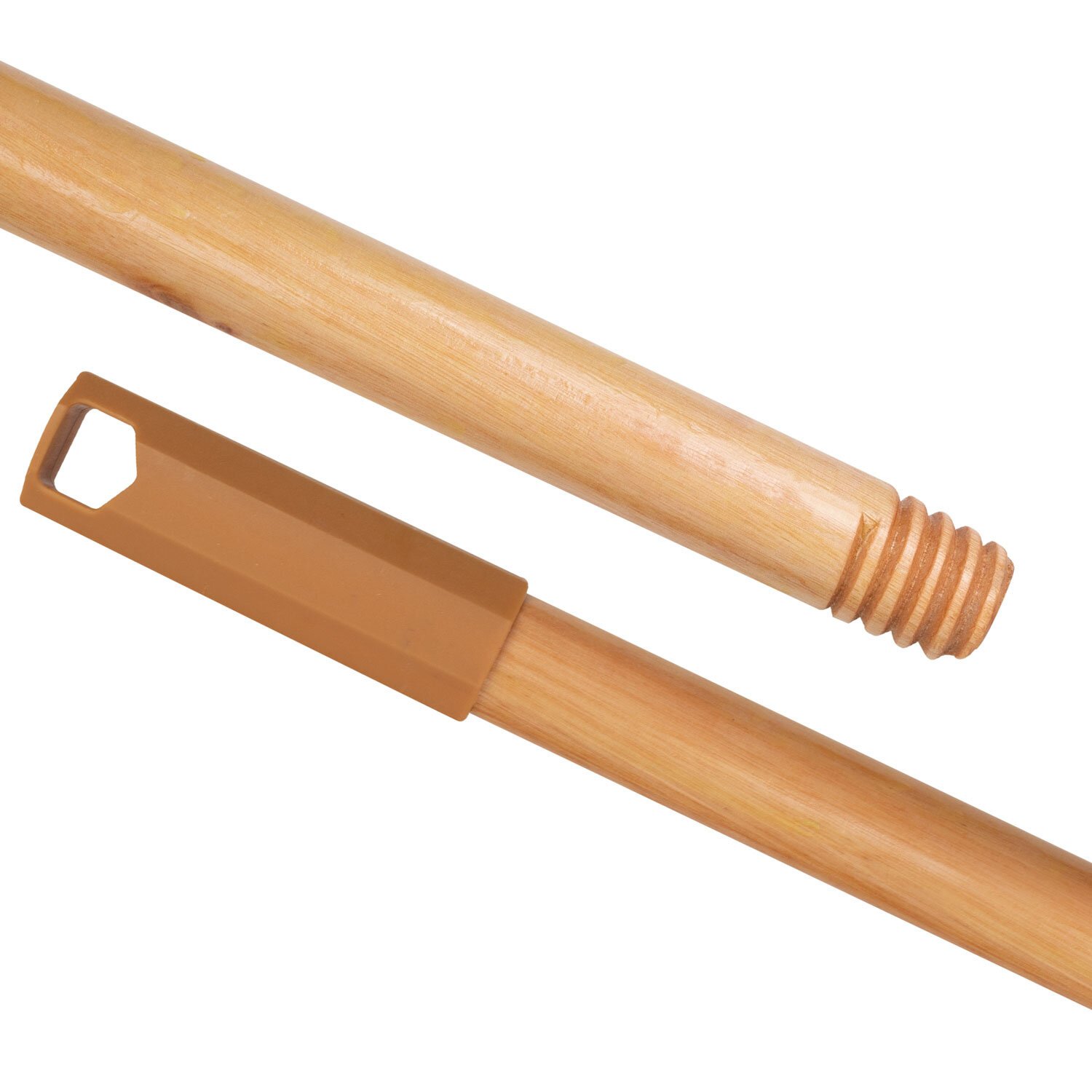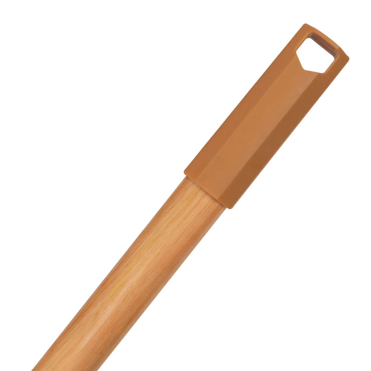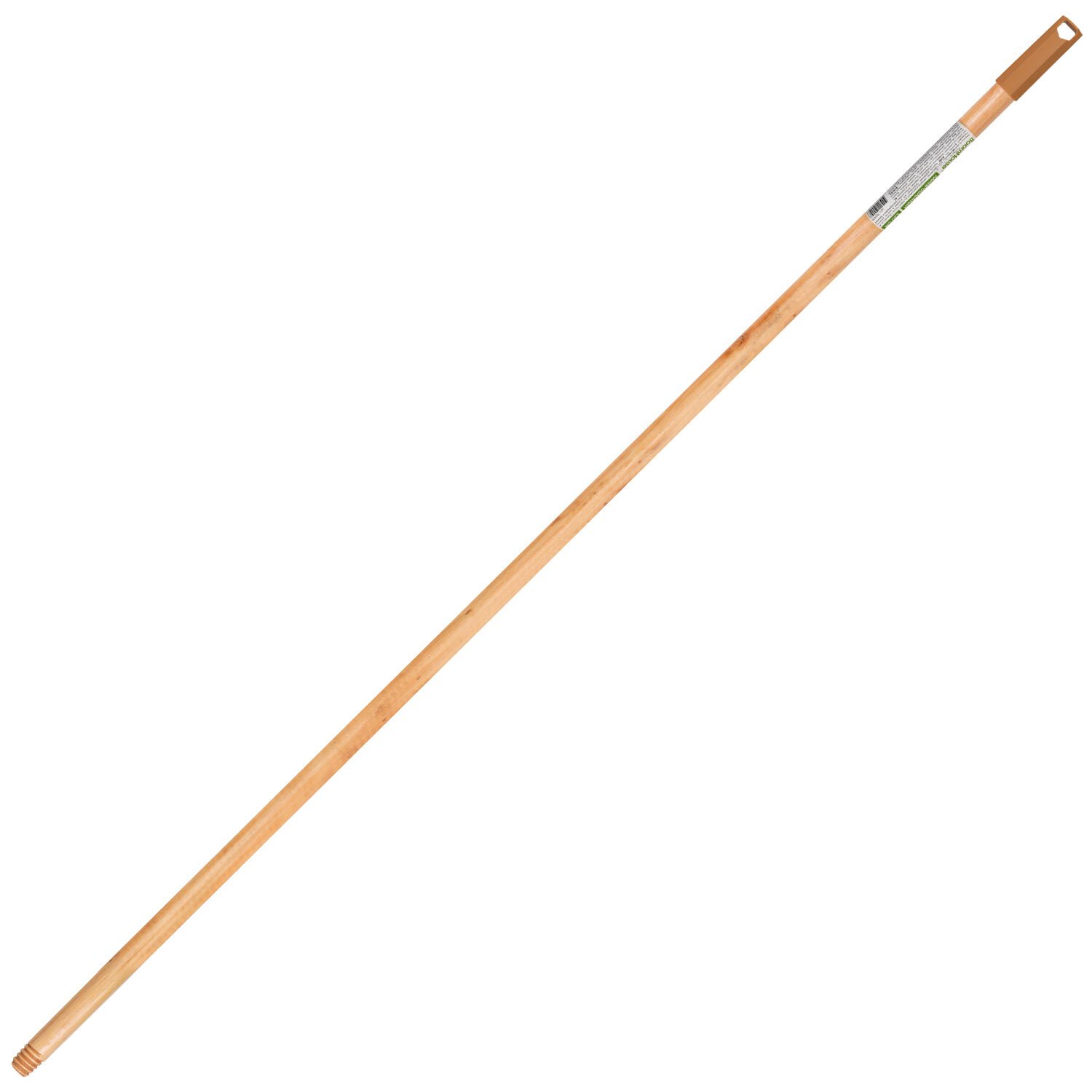 Черенок выполнен из древесины эвкалипта и покрыт лаком. Сверху черенок имеет колпачок с отверстием для подвешивания, для комфортного хранения в любом помещении. Снизу черенок имеет стандартную еврорезьбу, которая подойдет для большинства видов уборочного инвентаря.