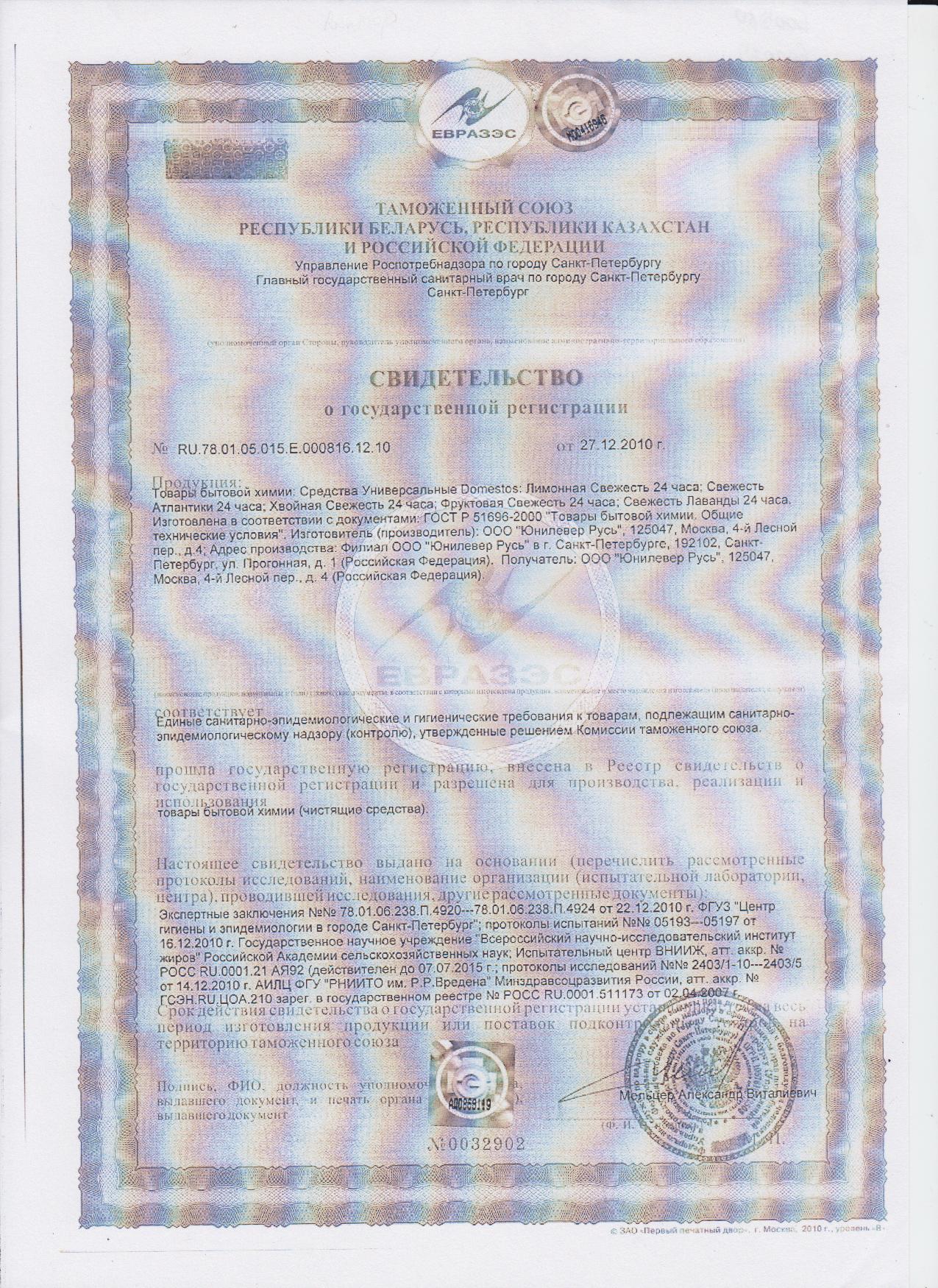 Универсальное средство для удаления загрязнений с различных поверхностей. Обладает дезинфицирующим и отбеливающим эффектом.