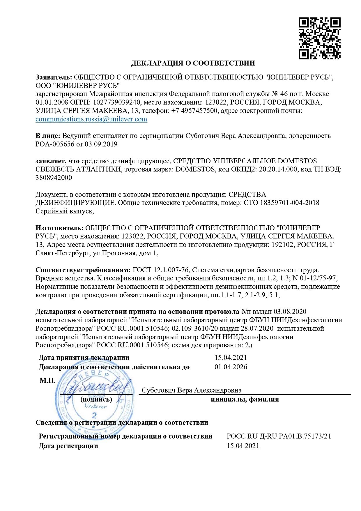 Дезинфицирующий компонент: гипохлорит натрия (2.7-3.3%).