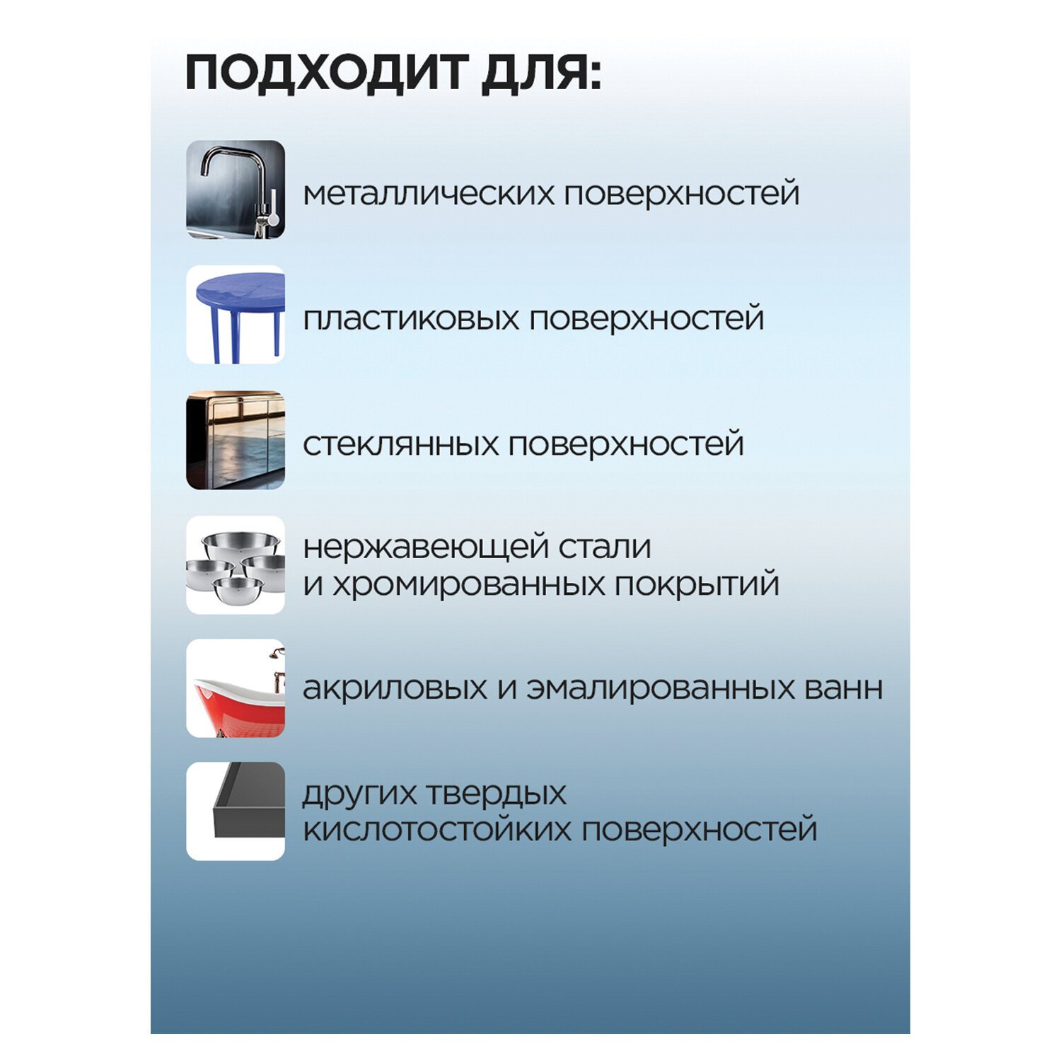 Средство для удаления известкового налета, ржавчины, остатков мыла и других специфических загрязнений в ванной комнате и на кухне.