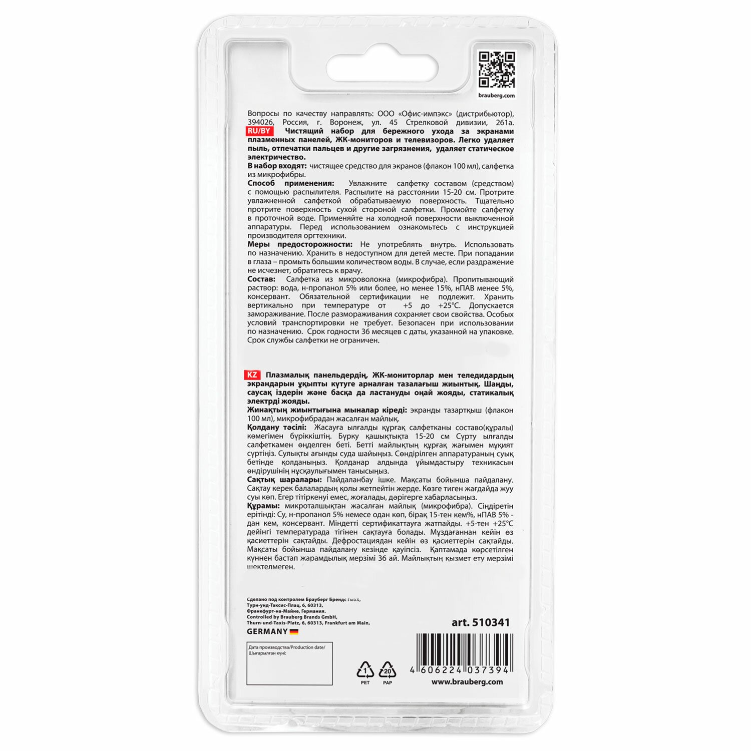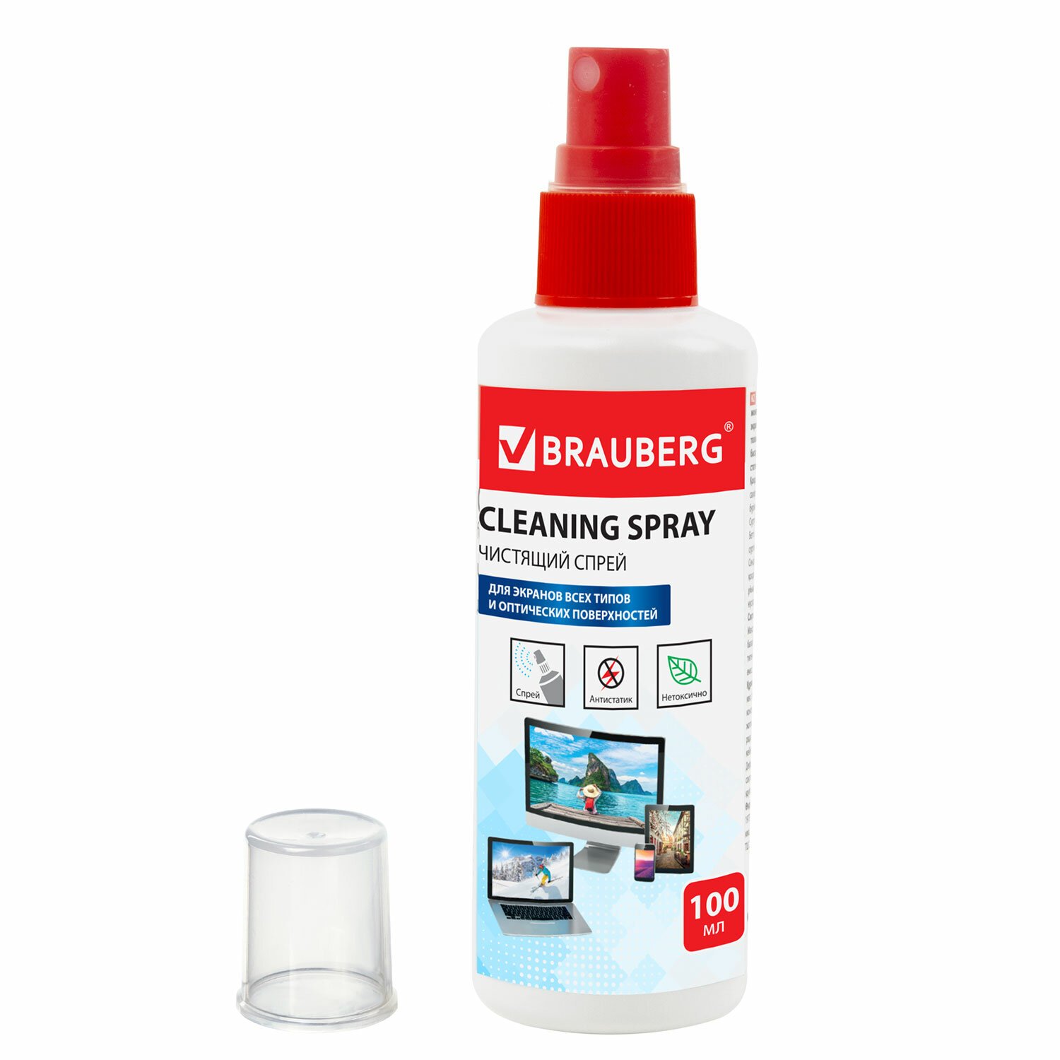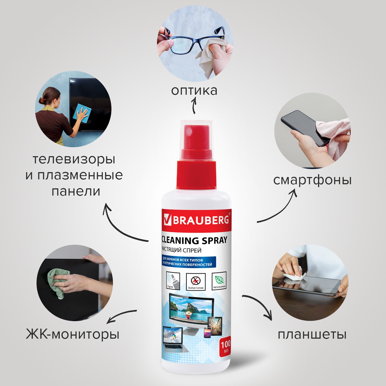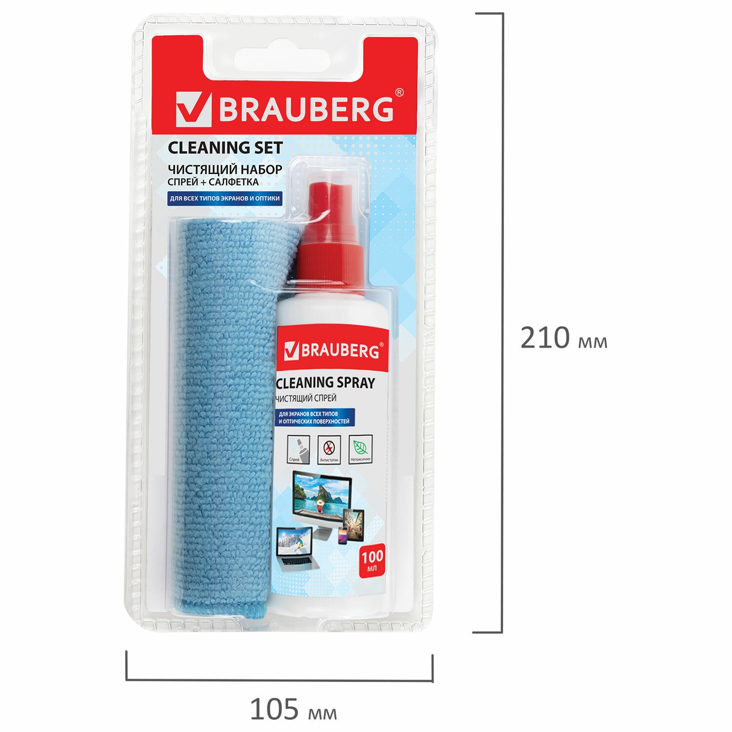 Чистящий набор BRAUBERG для ухода за экранами плазменных панелей, ЖК-мониторов, телевизоров и смартфонов легко удаляет пыль, отпечатки пальцев и другие загрязнения.