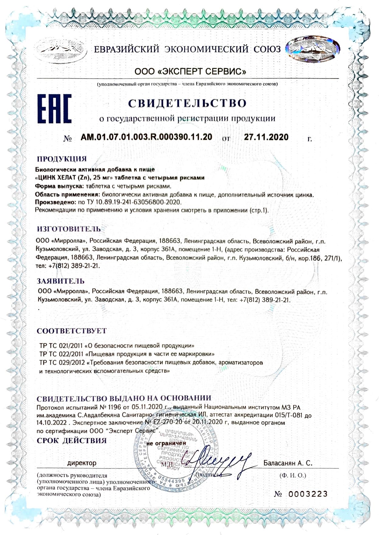 Цинк Хелат МИРРОЛЛА cпособствует ускоренной иммунной адаптации, нормализации репродуктивной функции мужского организма, повышению сопротивляемости организма к инфекционным заболеваниям, улучшению зрения, красоты кожи, волос и ногтей.