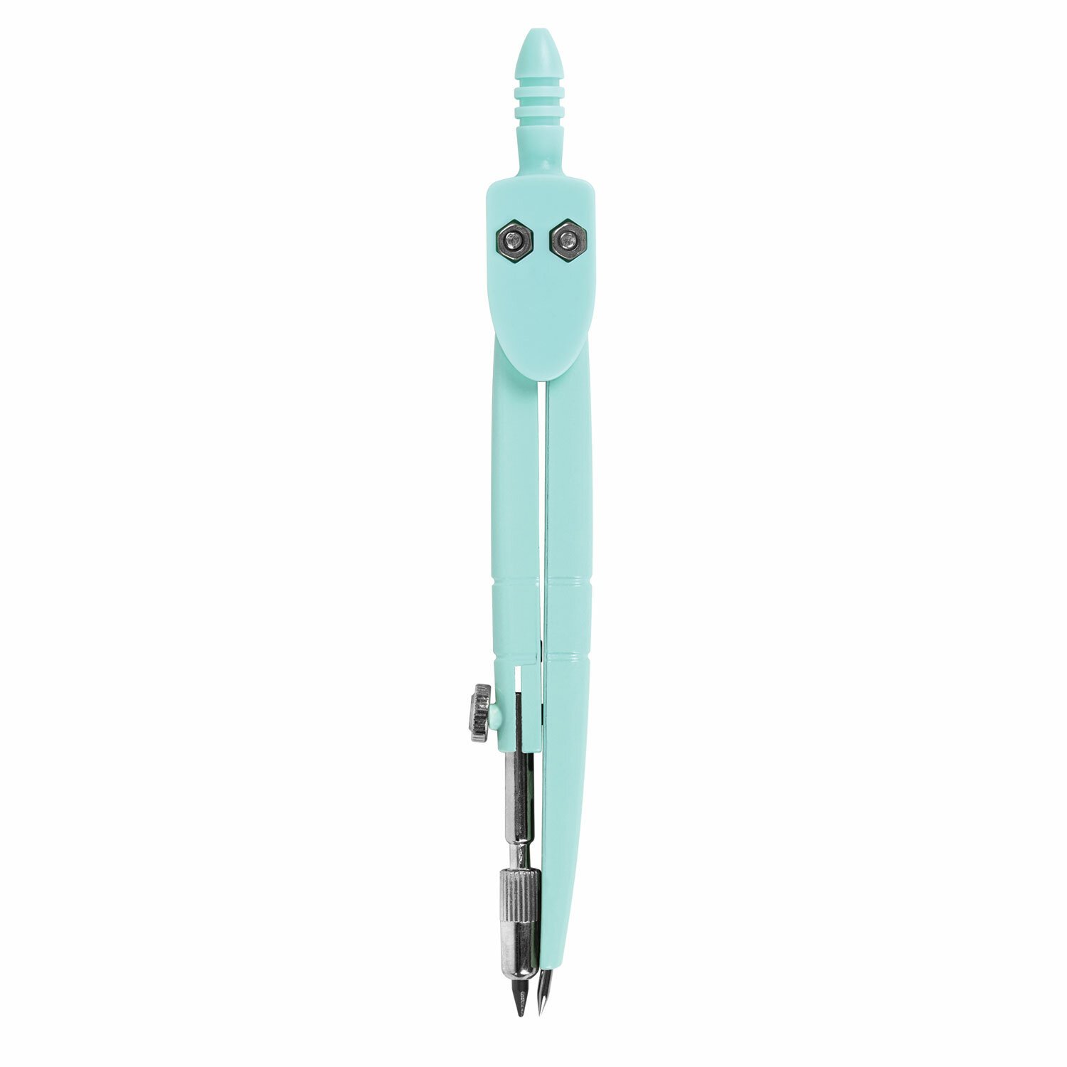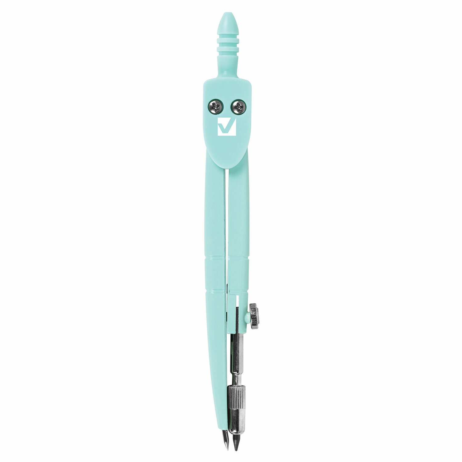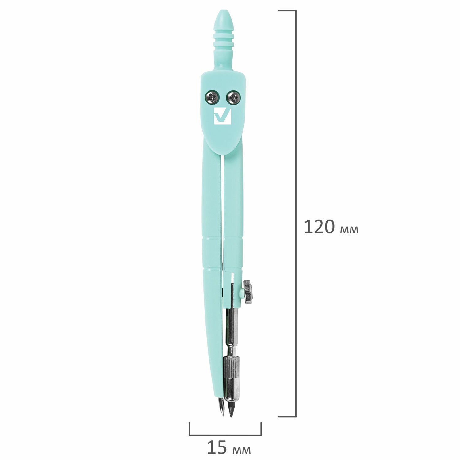 Инструмент длиной 120 мм имеет несгибаемые штанги и подстраиваемый грифель. Циркуль пастельно-бирюзового цвета изготовлен из металла, имеется пластиковый защитный колпачок.