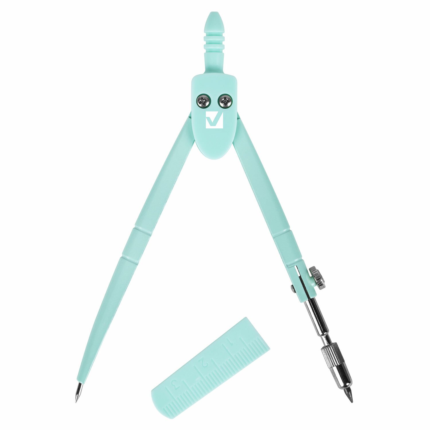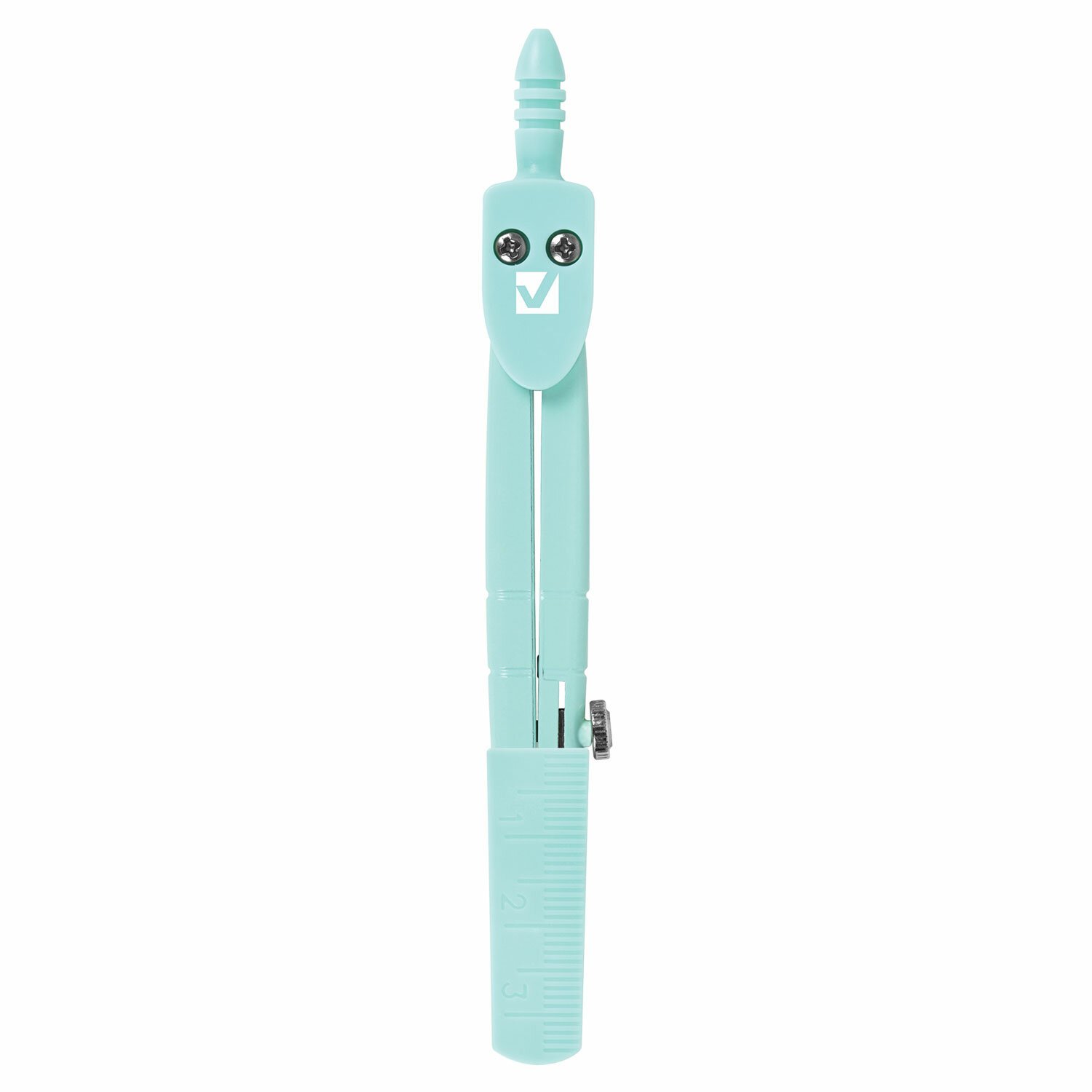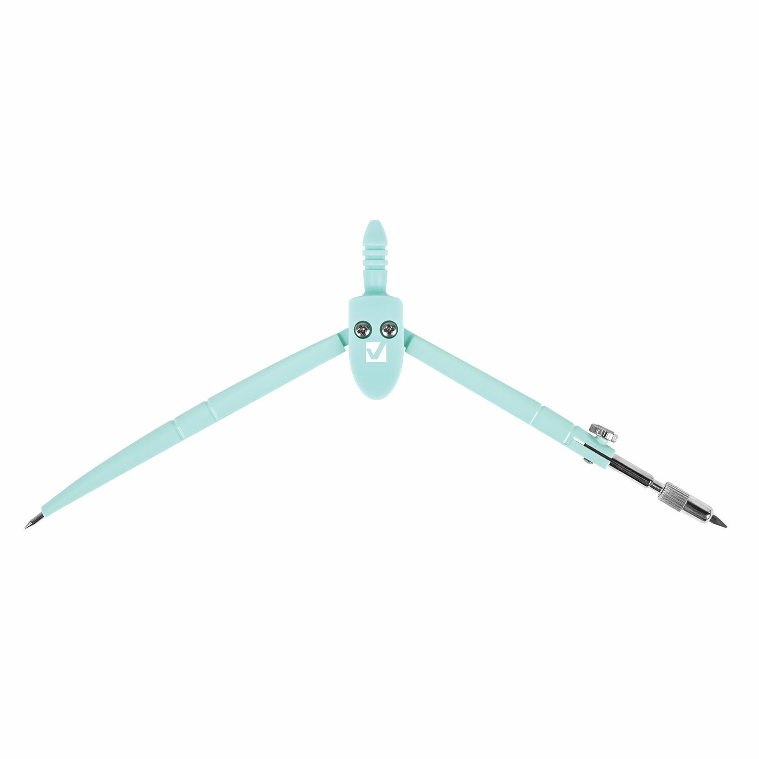 Инструмент длиной 120 мм имеет несгибаемые штанги и подстраиваемый грифель. Циркуль пастельно-бирюзового цвета изготовлен из металла, имеется пластиковый защитный колпачок.