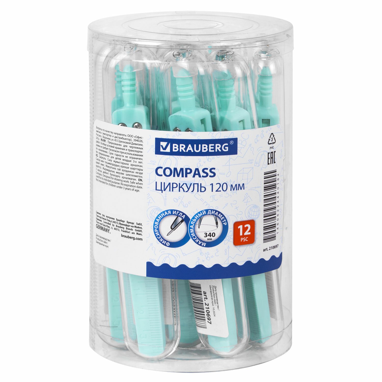 Циркуль BRAUBERG GEOMETRY, 120 мм, пастельно-зеленый цвет, защитный колпачок, пластиковый пенал, 210699