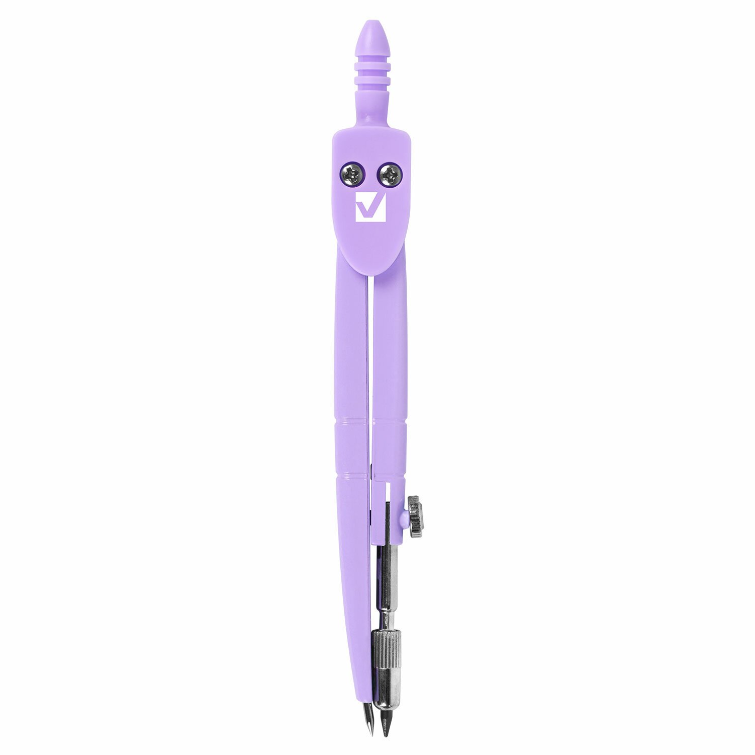 Инструмент длиной 120 мм имеет несгибаемые штанги и подстраиваемый грифель. Циркуль пастельно-фиолетового цвета, изготовлен из металла, с пластиковым защитным колпачком.