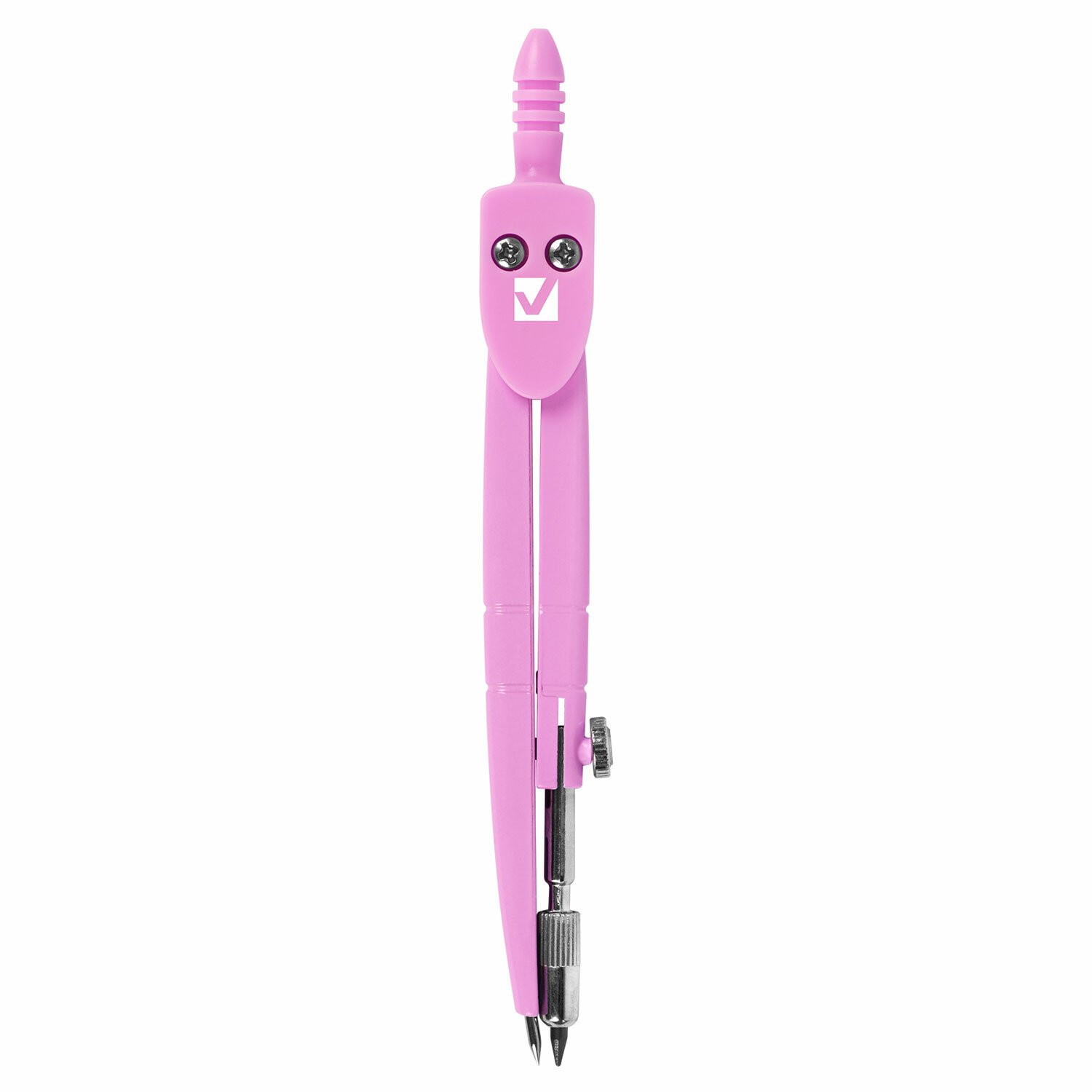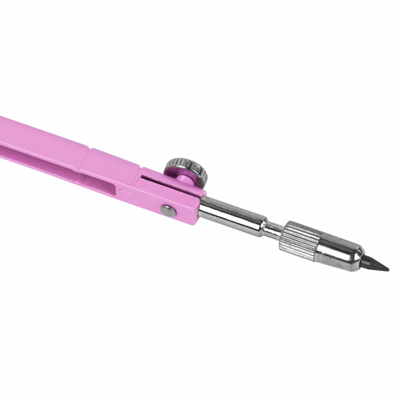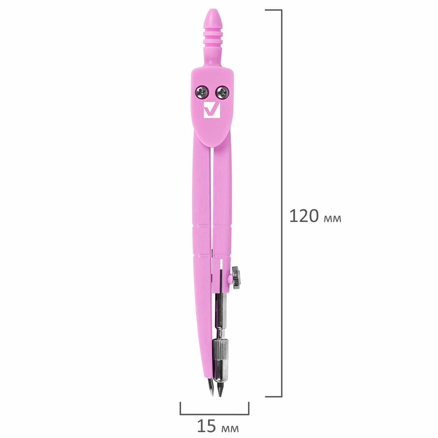 Инструмент длиной 120 мм имеет несгибаемые штанги и подстраиваемый грифель. Циркуль пастельно-розового цвета, изготовлен из металла, имеет пластиковый защитный колпачок.