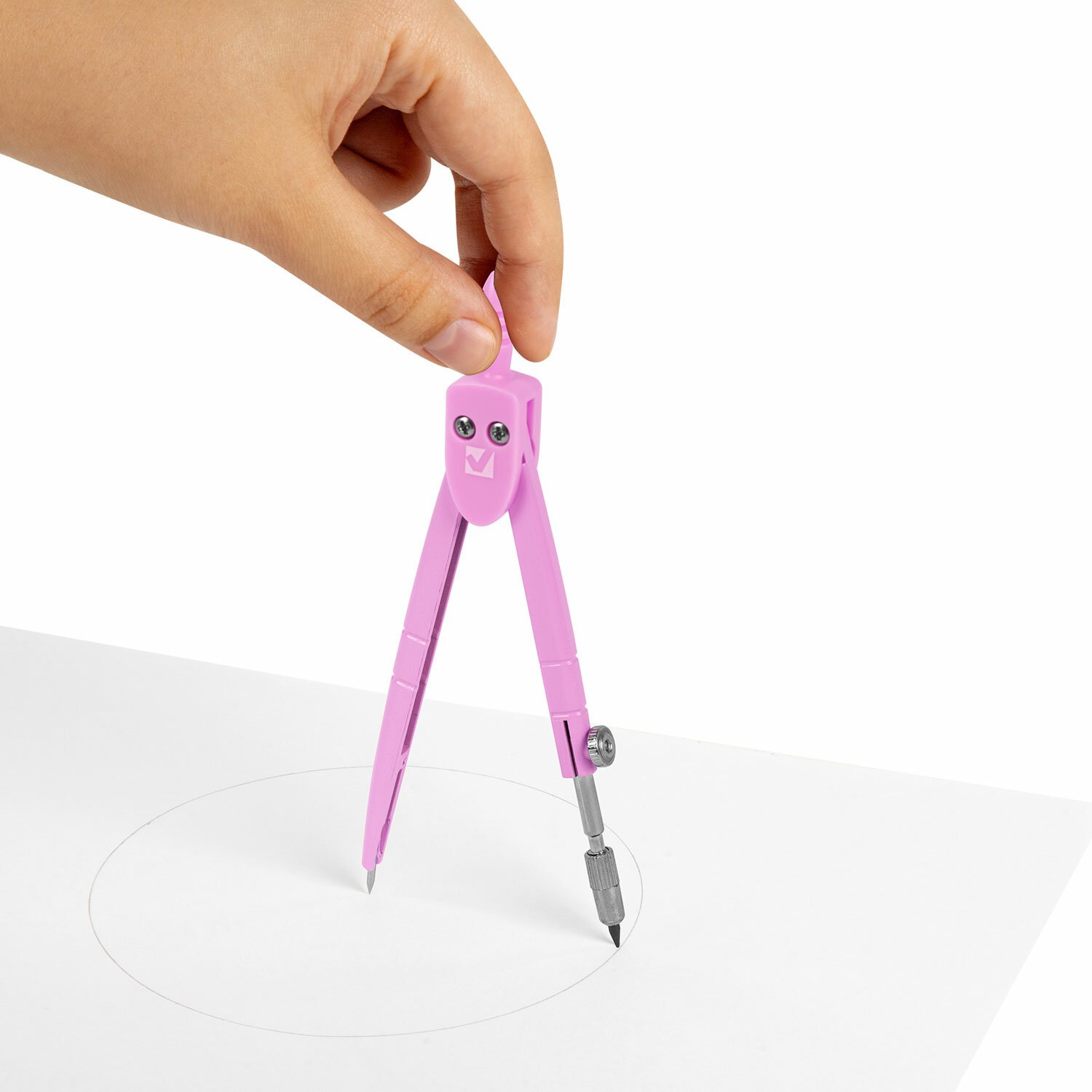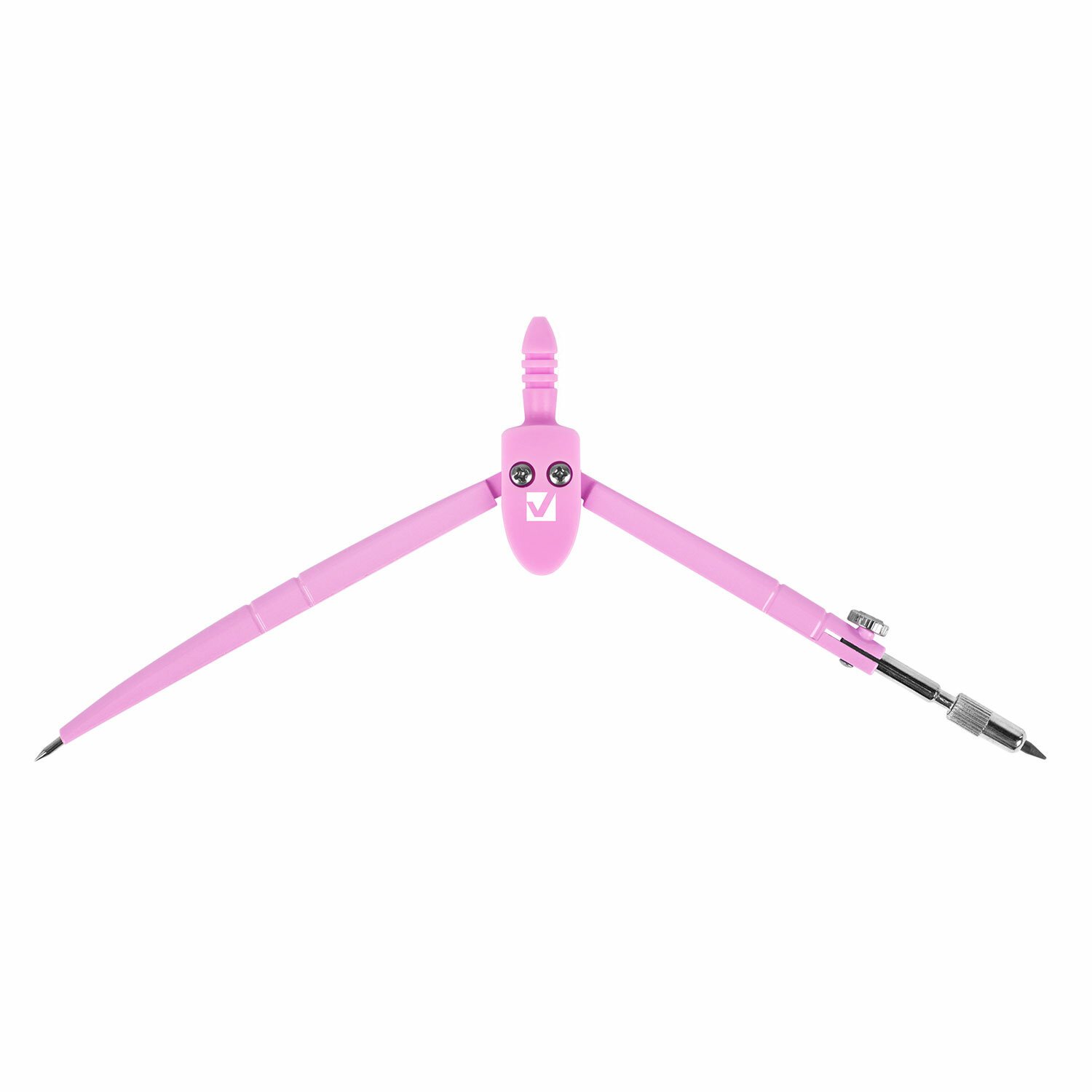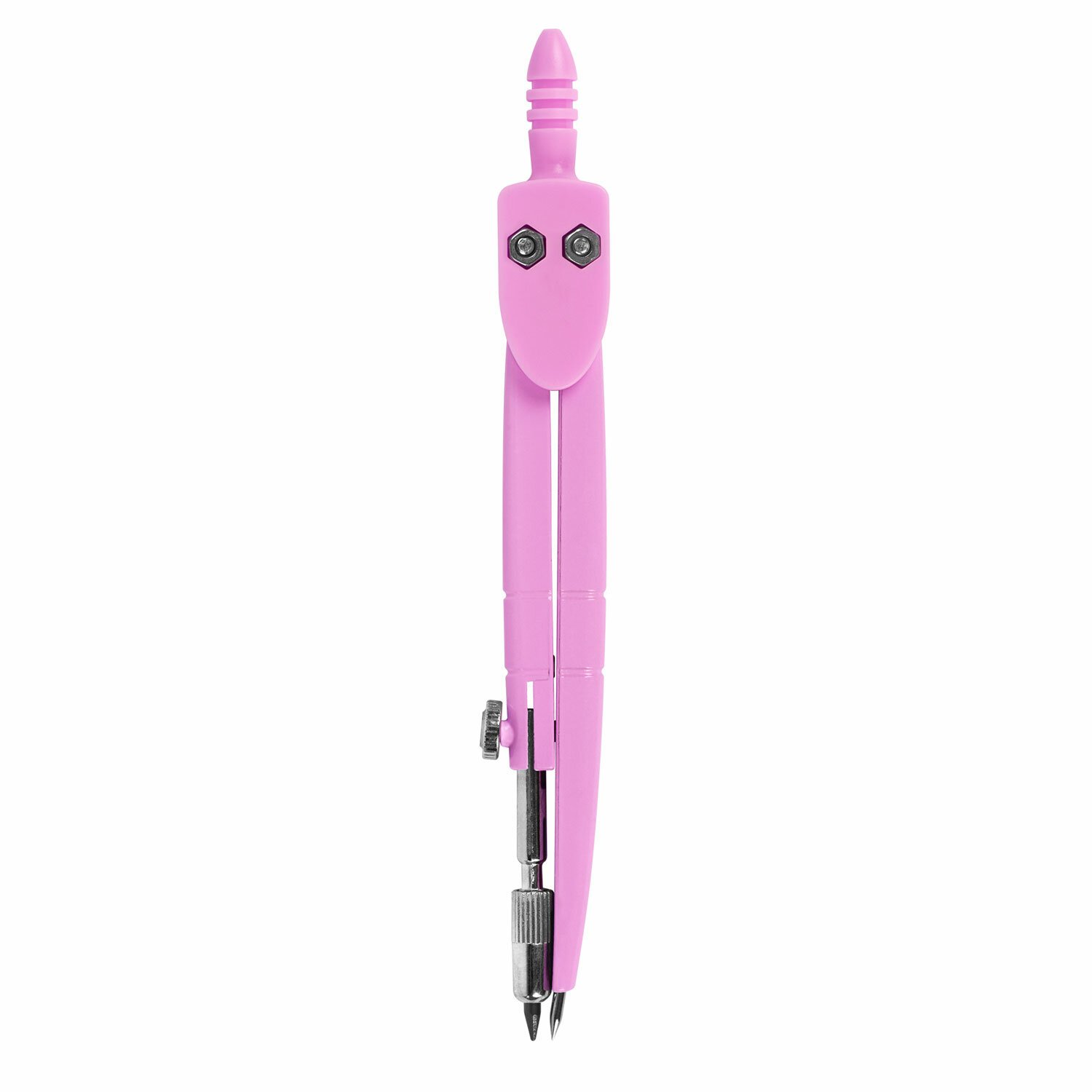 Инструмент длиной 120 мм имеет несгибаемые штанги и подстраиваемый грифель. Циркуль пастельно-розового цвета, изготовлен из металла, имеет пластиковый защитный колпачок.