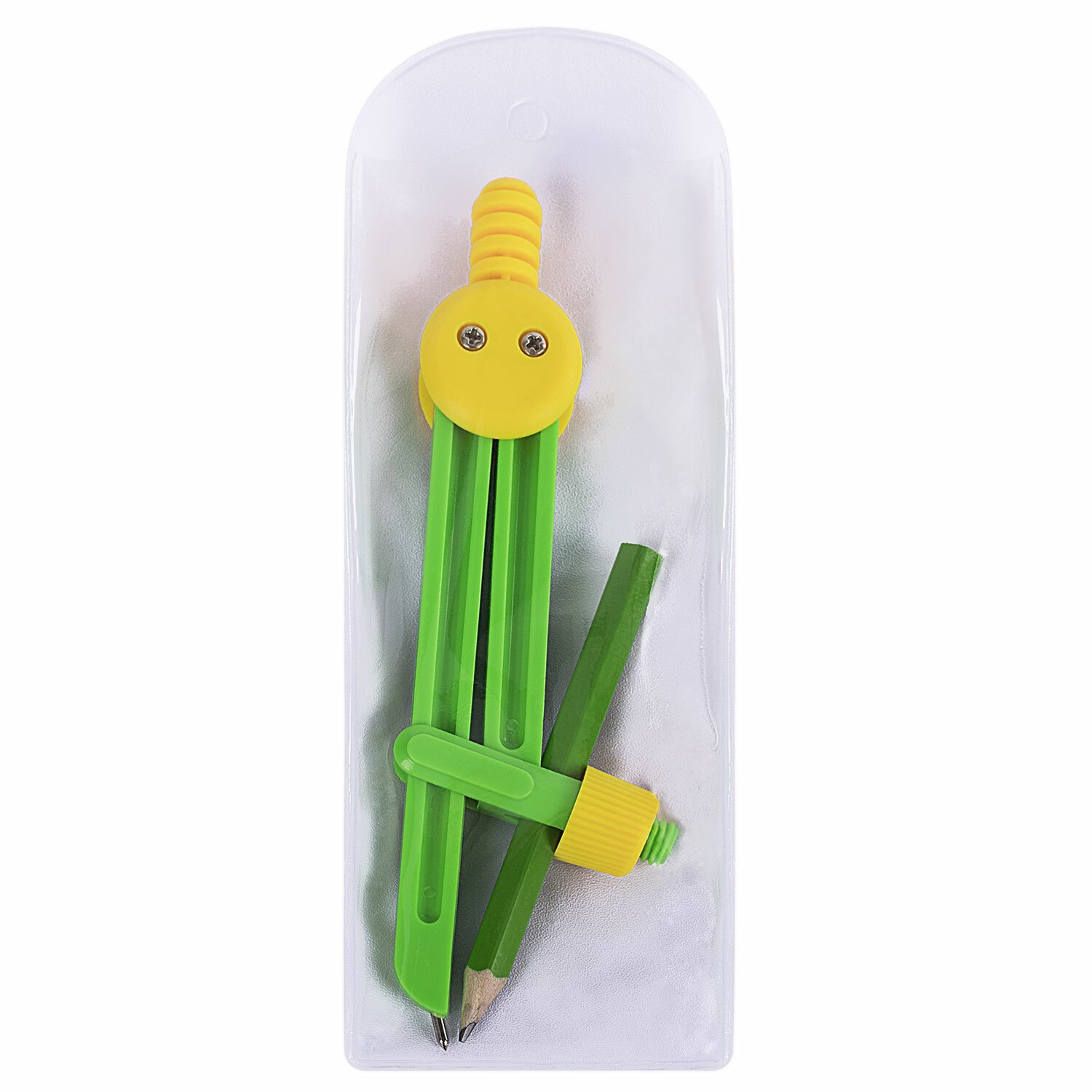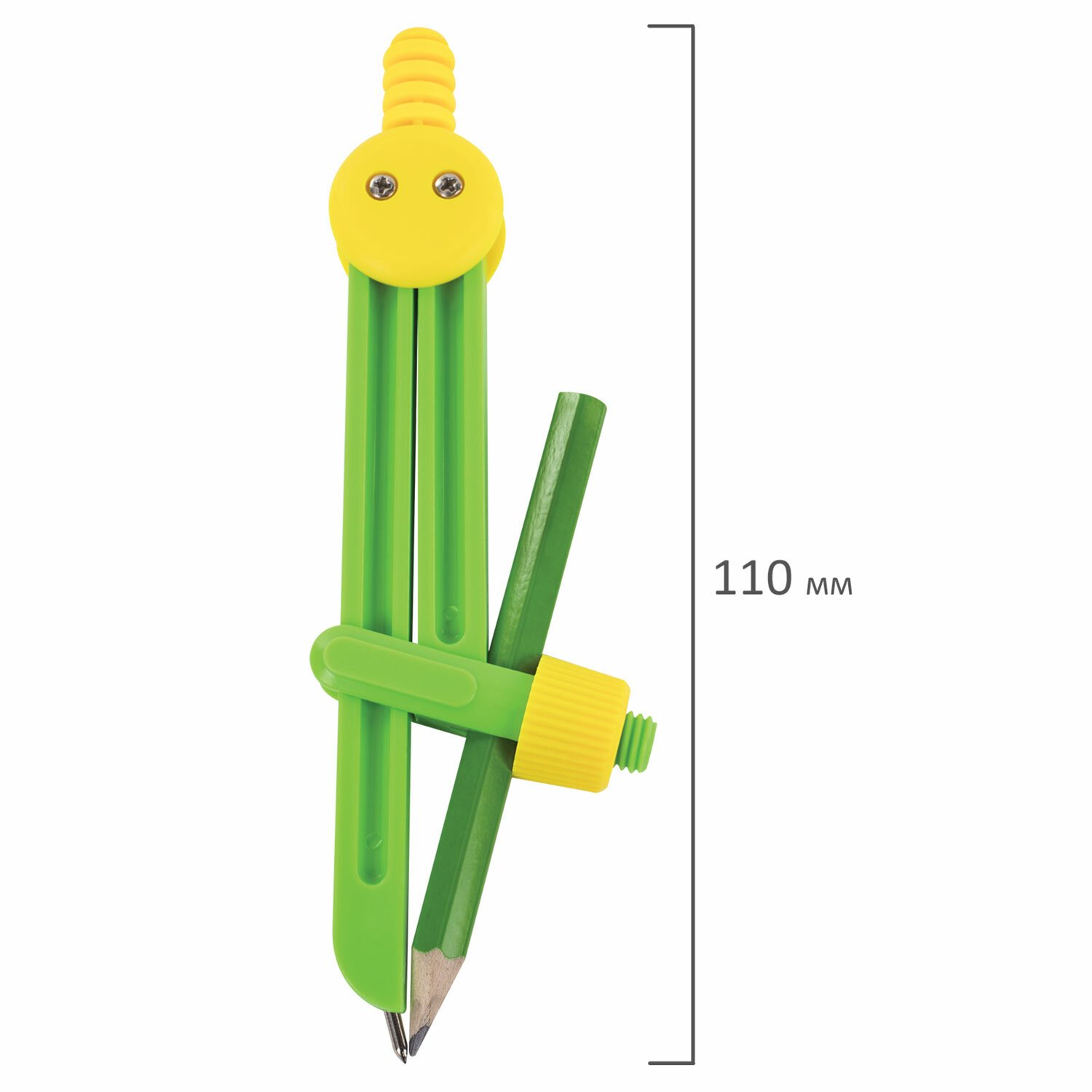 Инструмент длиной 110 мм имеет несгибаемые штанги и карандаш в комплекте. Изготовлен из пластика. Имеет удобную конструкцию и привлекательный дизайн. Минимальный диаметр вычерчиваемой окружности - 0,5 см. Цвет - ассорти. Поставляется в ПВХ-чехле.