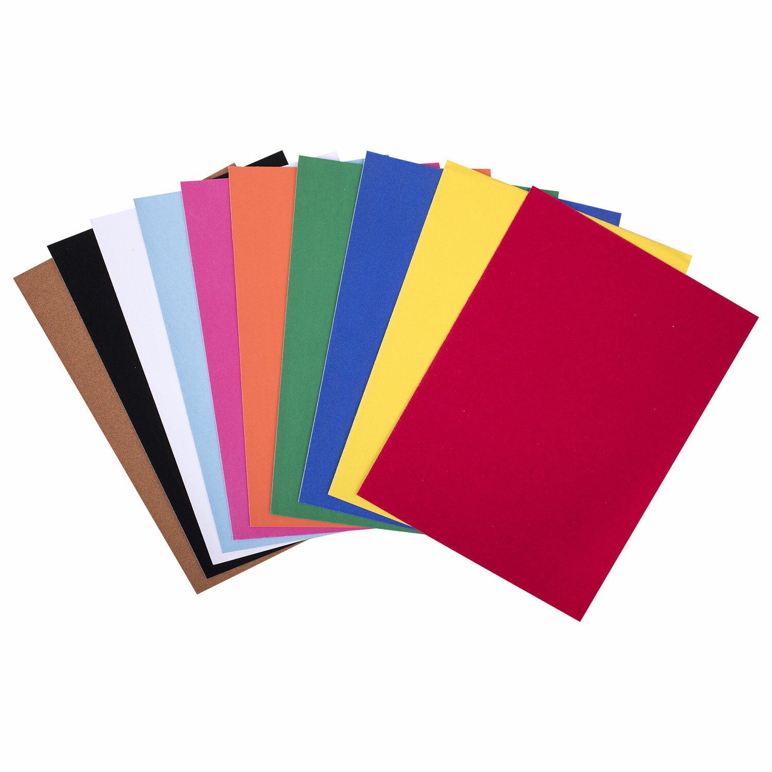 Набор самоклеящейся бархатной односторонней цветной бумаги плотностью 110 г/м2 включает 10 листов формата А4 (210х297 мм) в 10-ти разнообразных и насыщенных однородных цветах. Листы упакованы в полиэтиленовый пакет с липким краем, легко режутся и сгибаются.