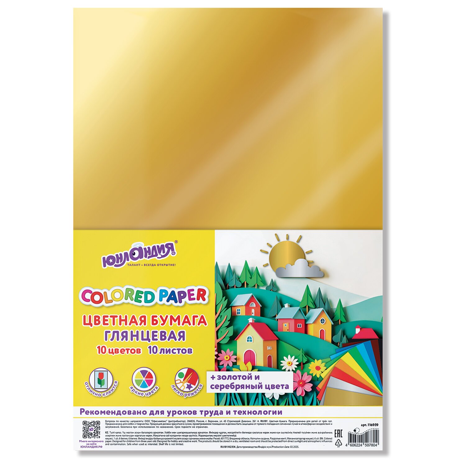 Набор мелованной (глянцевой) односторонней цветной бумаги плотностью 90 г/м2 включает 8 листов формата А4 (200х280 мм) в 8-ми разнообразных и насыщенных однородных цветах + 2 листа мелованной бумаги плотностью 90 г/м - золотого и серебряного цвета. Листы легко режутся и сгибаются.