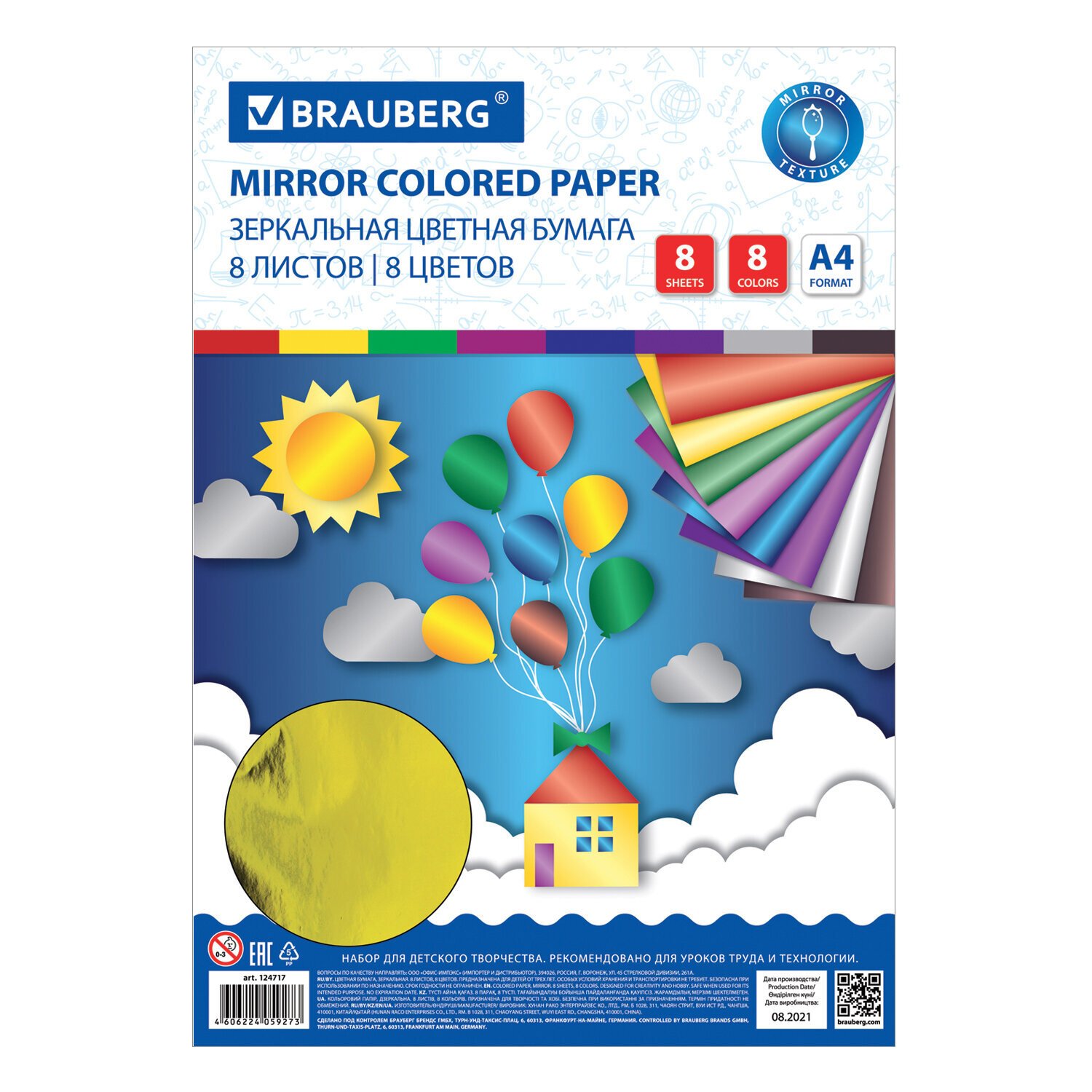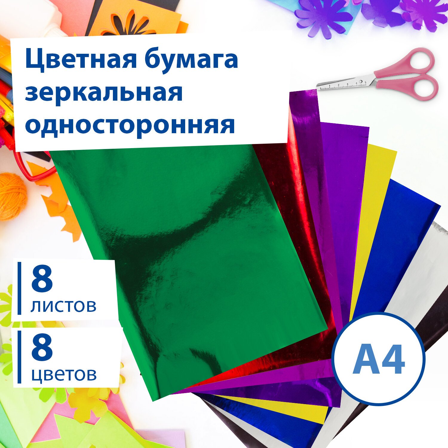 Цветная бумага А4 ЗЕРКАЛЬНАЯ, 8 листов 8 цветов, BRAUBERG, 124717