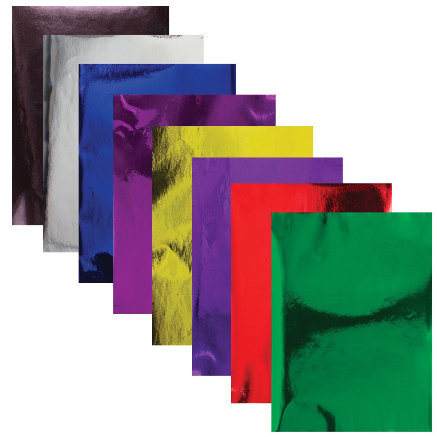Набор зеркальной (металлизированной пленка) односторонней цветной бумаги плотностью 80 г/м2 включает 8 листов формата А4 (210х297 мм) в 8-ми разнообразных и насыщенных однородных цветах. Листы упакованы в полиэтиленовый пакет с липким краем, легко режутся и сгибаются.
