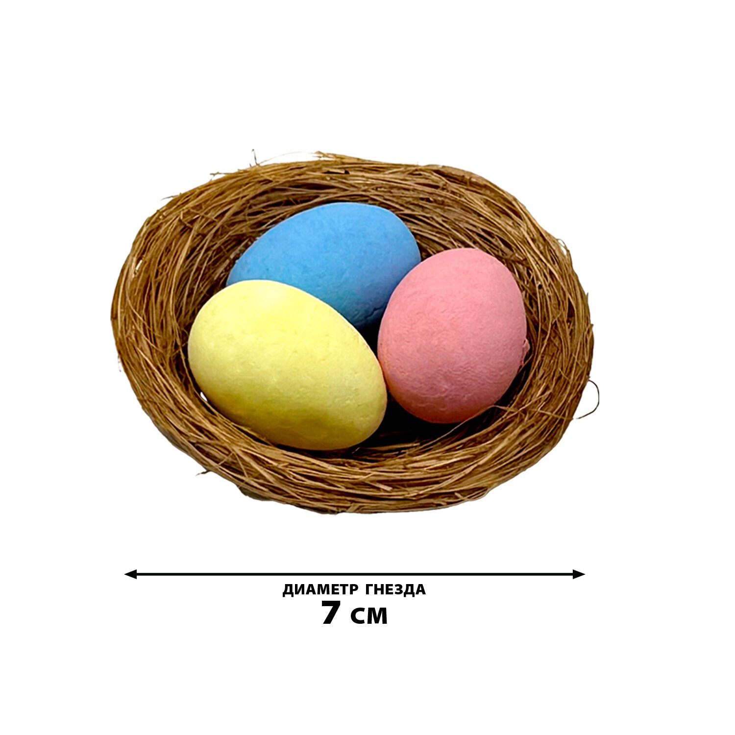 Комплект гнезд их 3 шт. диаметром 7 см каждое с яичками внутри — идеальный выбор для тех, кто хочет создать тёплую, уютную атмосферу праздника, наполненную символами обновления и заботы. Идеально подходит для оформления праздничного стола, интерьера, подарка или выпечки.