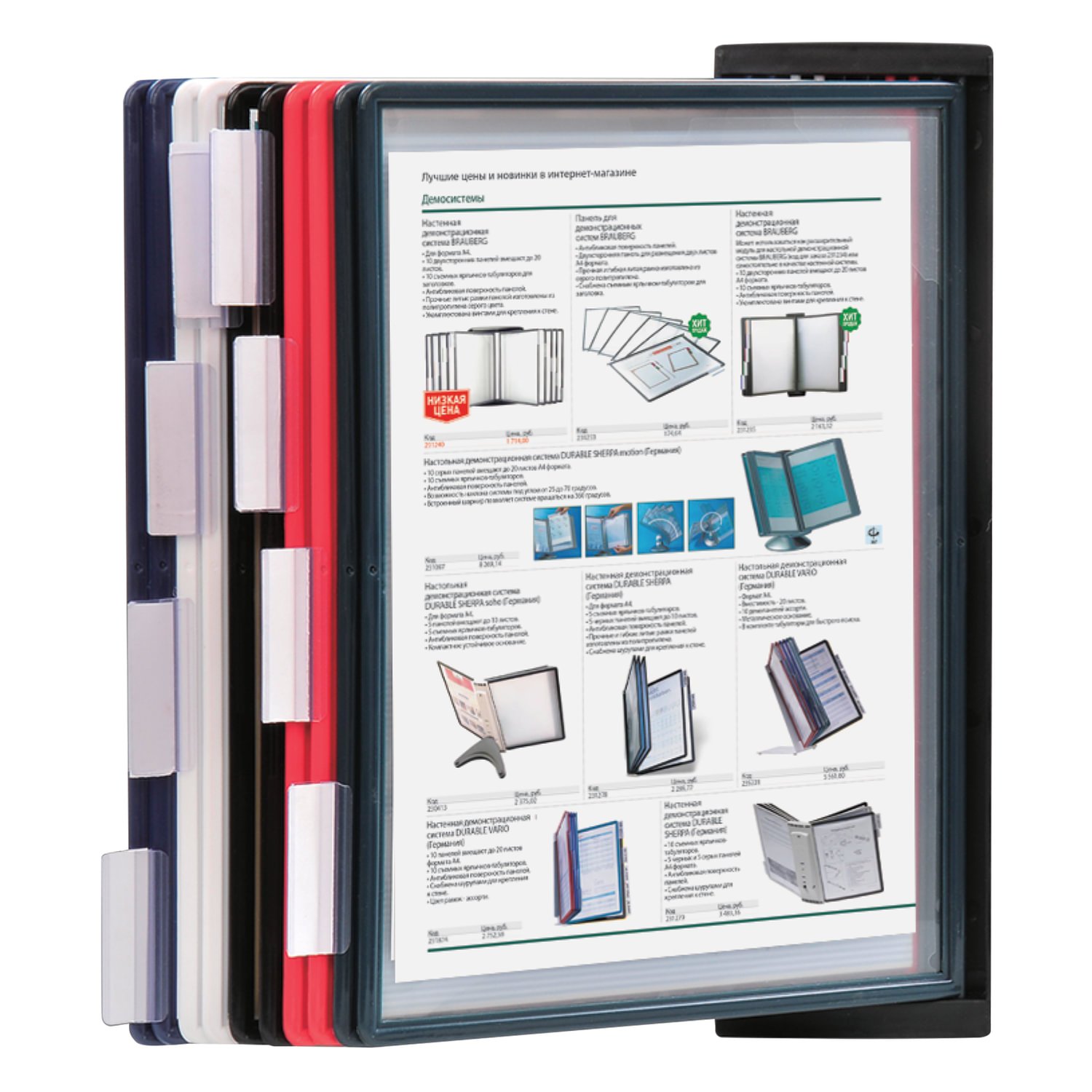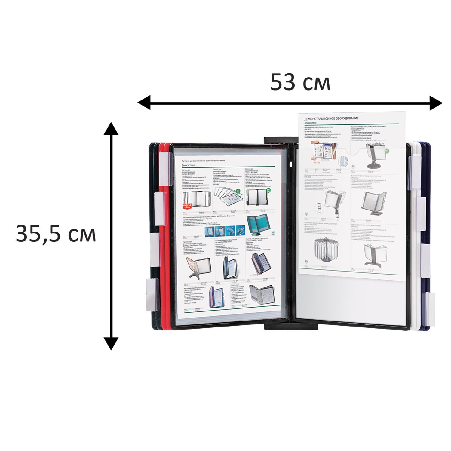 10 двухсторонних цветных панелей позволяют разместить одновременно до 20 листов формата А4. Прочные и гибкие литые рамки панелей изготовлены из полипропилена, пригодного для повторной переработки и дальнейшего использования. Демопанели оснащены съемными ярлычками-табуляторами для маркировки и удобного поиска нужной информации. Карман демопанели из прочного прозрачного материала с антибликовым покрытием надежно защитит документы от внешних воздействий. Винты для крепления демосистемы к стене поставляются в комплекте. Стильный черный цвет пластикового корпуса подойдёт для большинства современных интерьеров.
