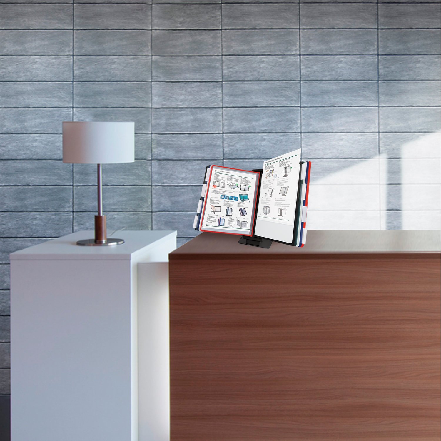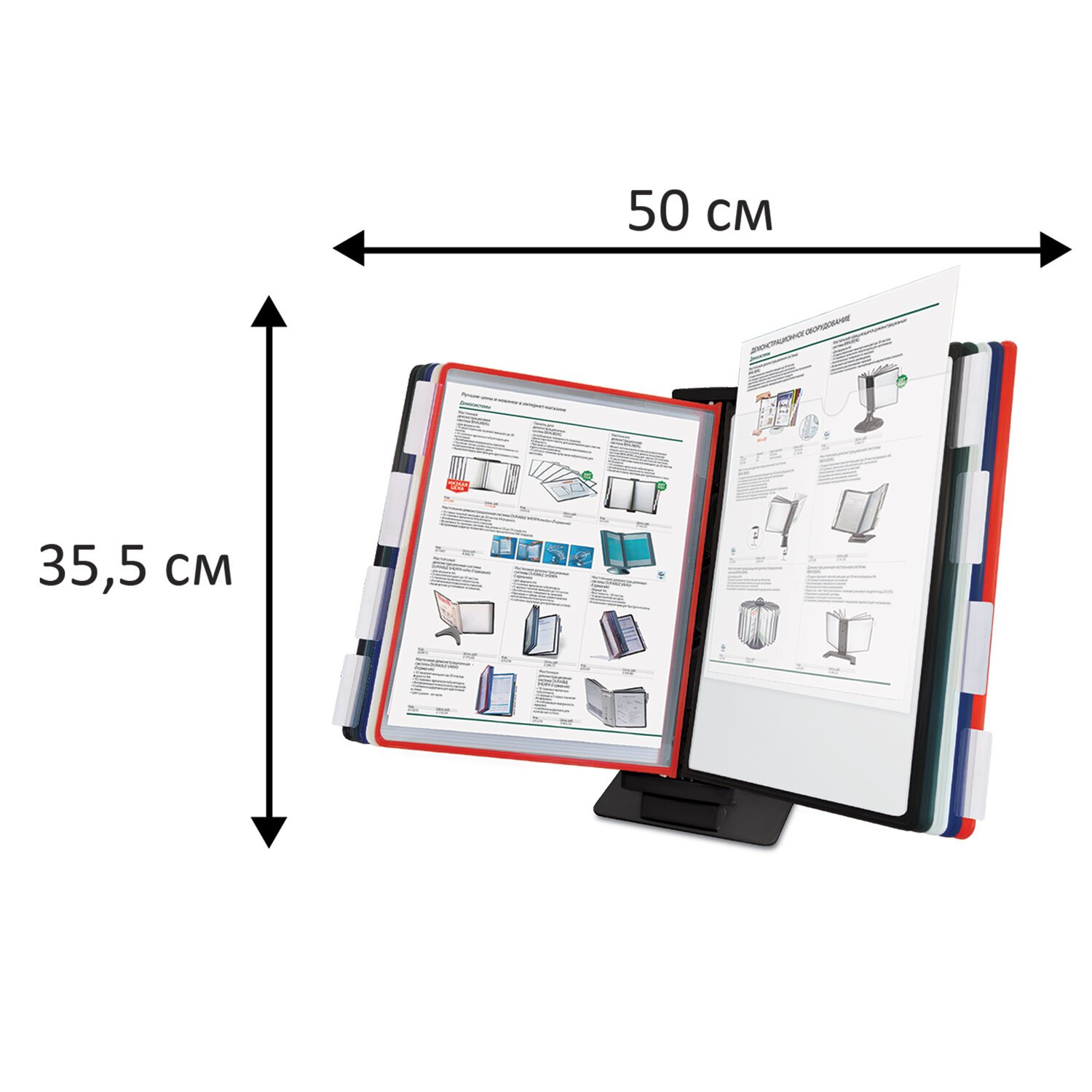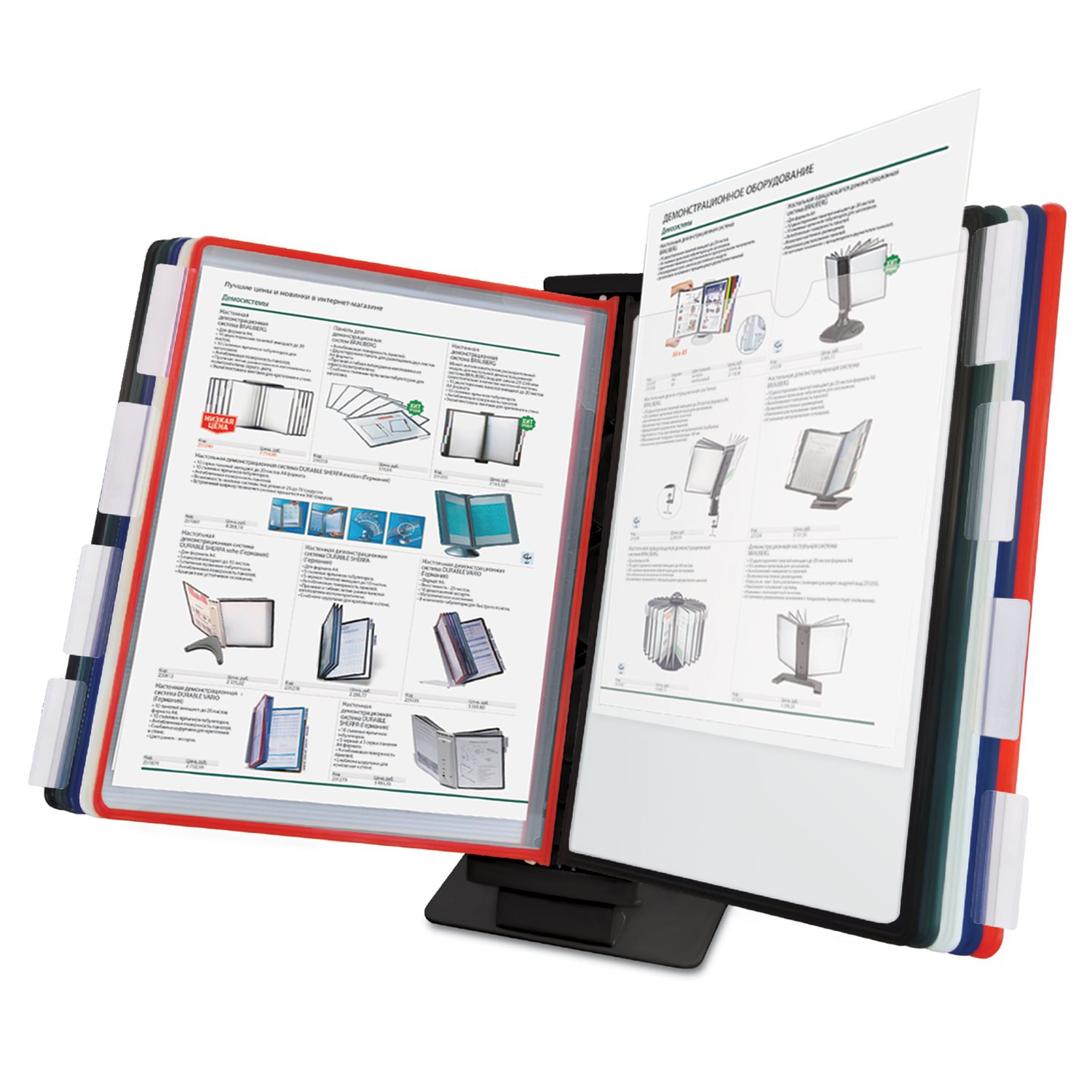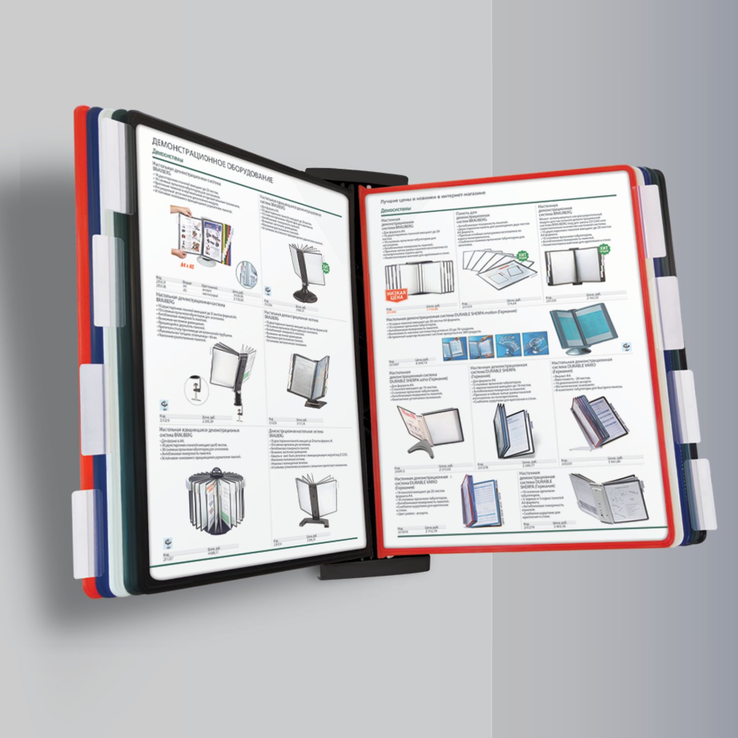 10 двухсторонних цветных панелей позволяют разместить одновременно до 20 листов формата А4. Прочные и гибкие литые рамки панелей изготовлены из полипропилена, пригодного для повторной переработки и дальнейшего использования. Демопанели оснащены съемными ярлычками-табуляторами для маркировки и удобного поиска нужной информации. Карман демопанели из прочного прозрачного материала с антибликовым покрытием надежно защитит документы от внешних воздействий. Возможно как настольное, так и настенное размещение. Стильный черный цвет пластикового корпуса подойдёт для большинства современных интерьеров.