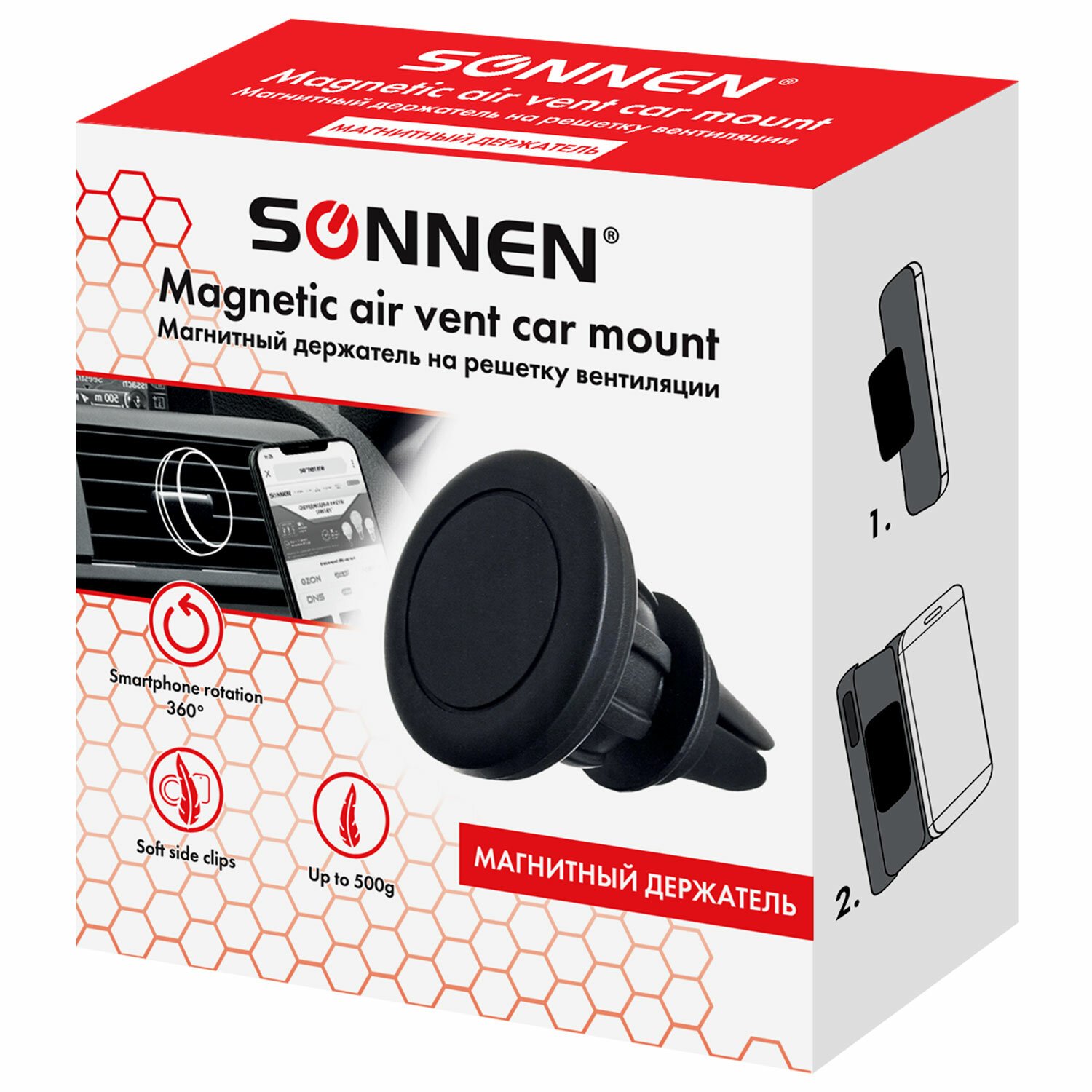 Держатель для телефона магнитный в авто на решетку вентиляции SONNEN, вращение 360°, 354923
