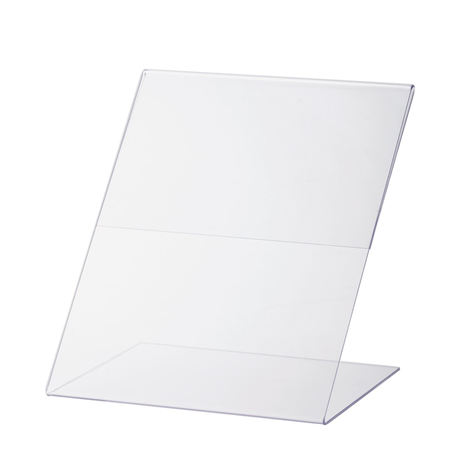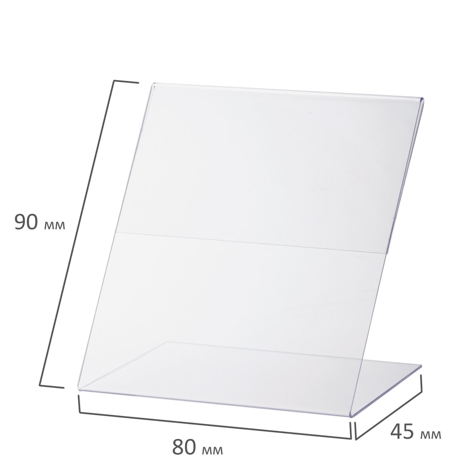 Изготовлена из прозрачного акрилового стекла толщиной 1 мм. Имеет размер 90х80 мм. Максимальная толщина вставки составляет 1,5 мм, глубина основания держателя информации - 45 мм, ширина ножки - 1 мм. 10 штук в комплекте.