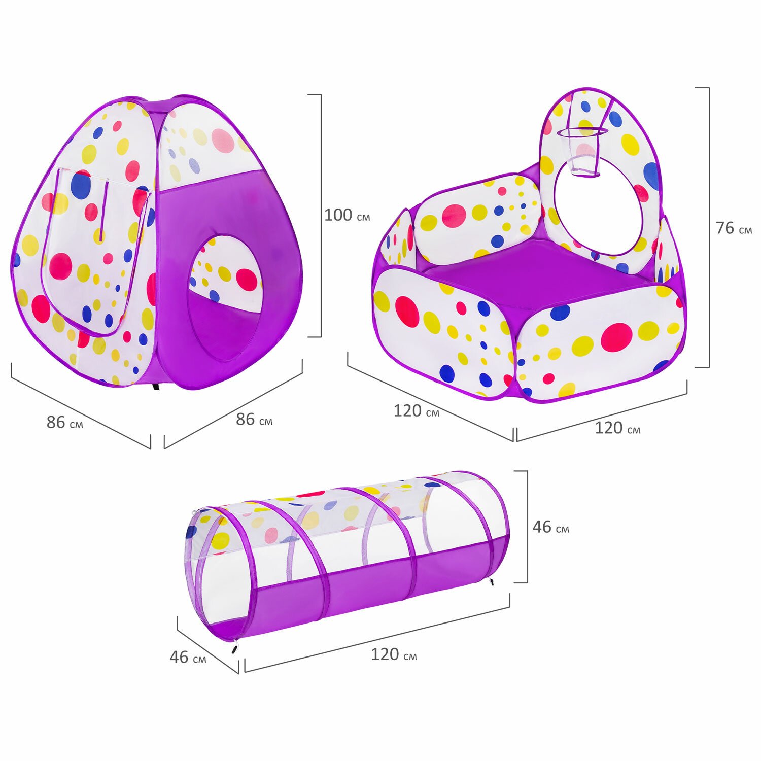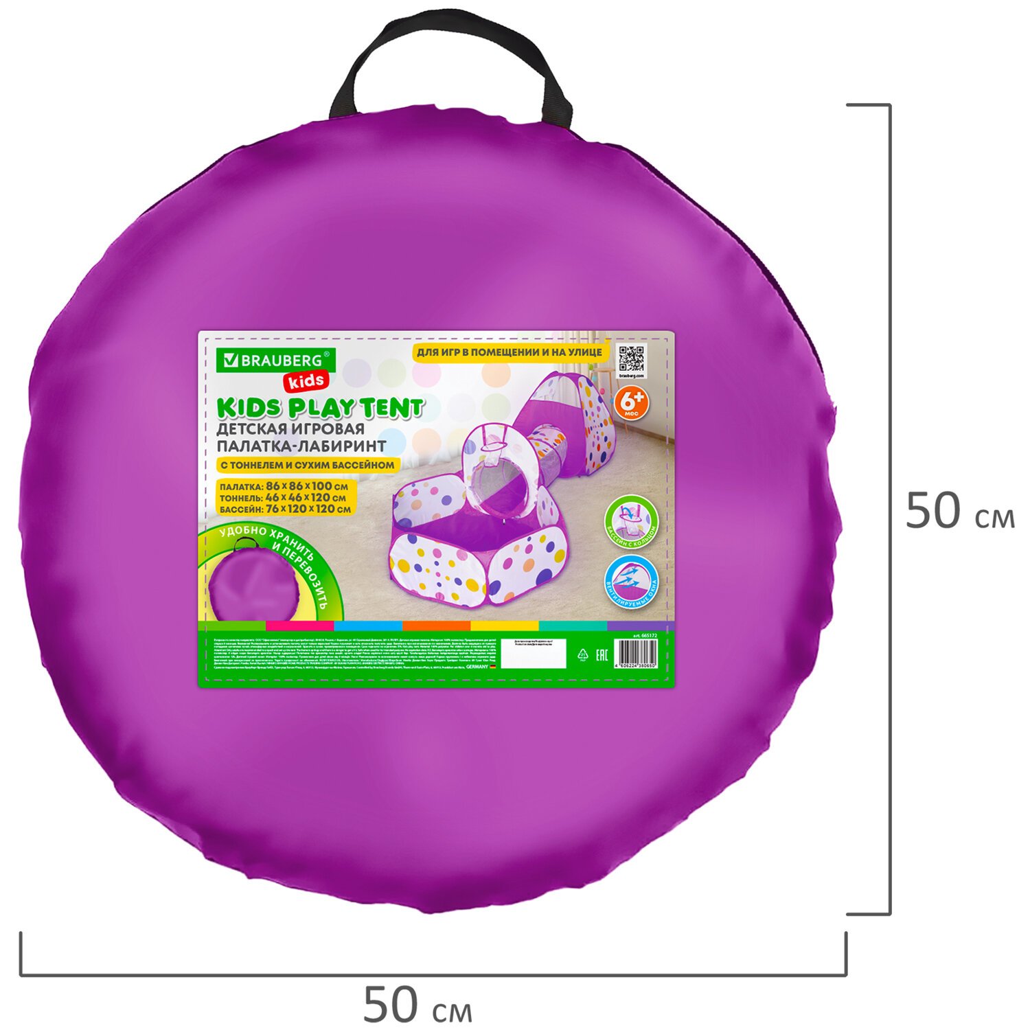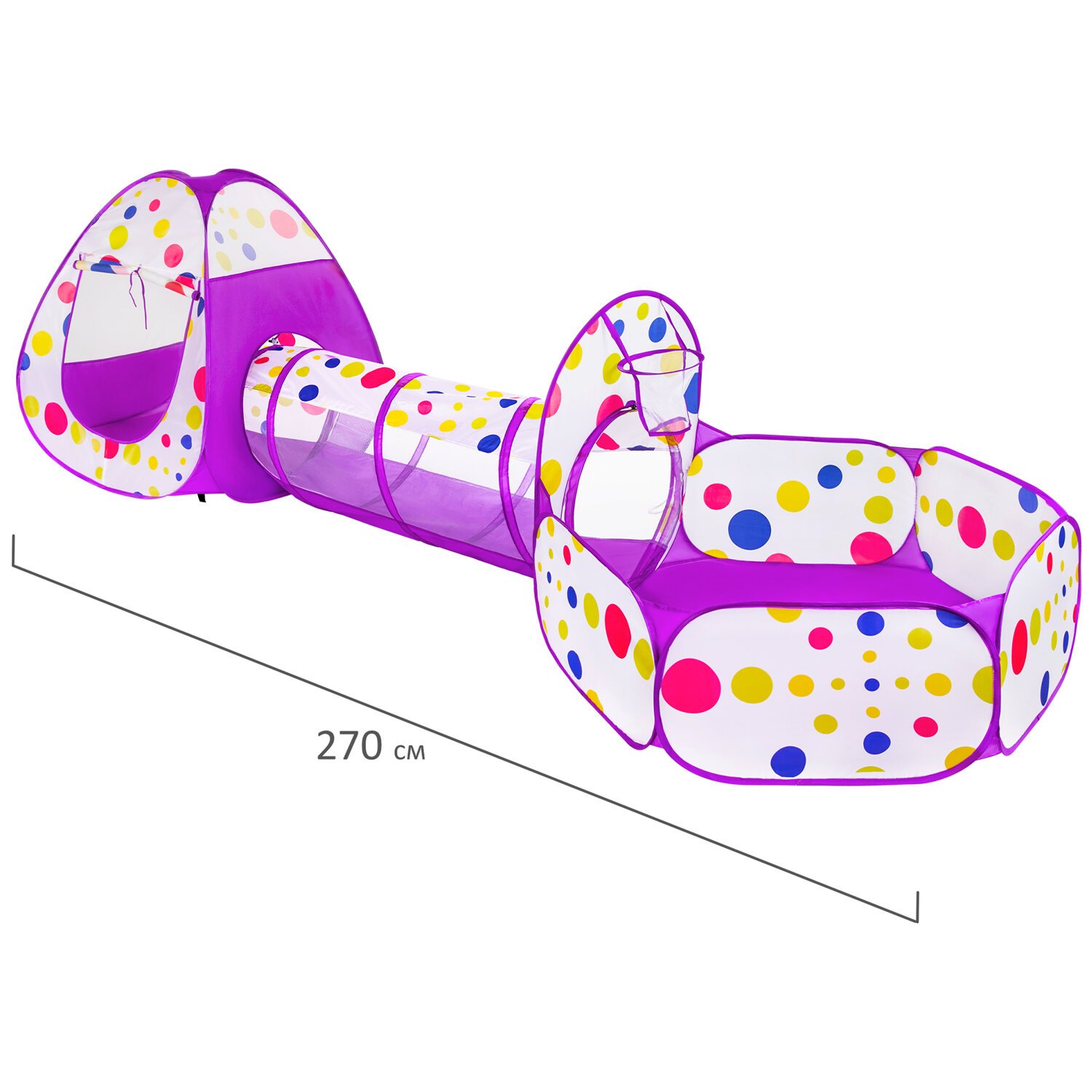 Детская игровая палатка-лабиринт BRAUBERG KIDS оснащена тоннелем и сухим бассейном с баскетбольным кольцом (шарики в комплект не входят). При этом все 3 элемента компактно упакованы в небольшую сумку размером 50х50х4 см. Каждый элемент легко раскладывается и быстро складывает. Размеры каждого элемента палатки: