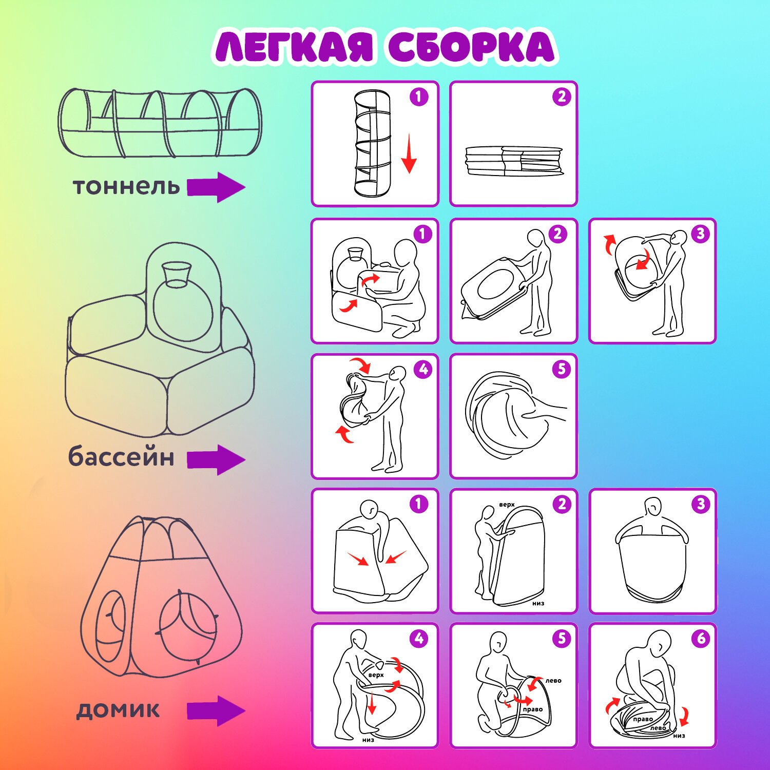 Детская игровая палатка-лабиринт с тоннелем и сухим бассейном – это готовая игровая площадка, незаменимая для сюжетно-ролевых игр, где ребенок может придумать множество вариантов декора любимого места игр и отдыха, укрыться от мира взрослых и почувствовать себя полноправным хозяином собственного уголка, куда можно приглашать гостей и устанавливать свои правила, что способствует развитию фантазии.