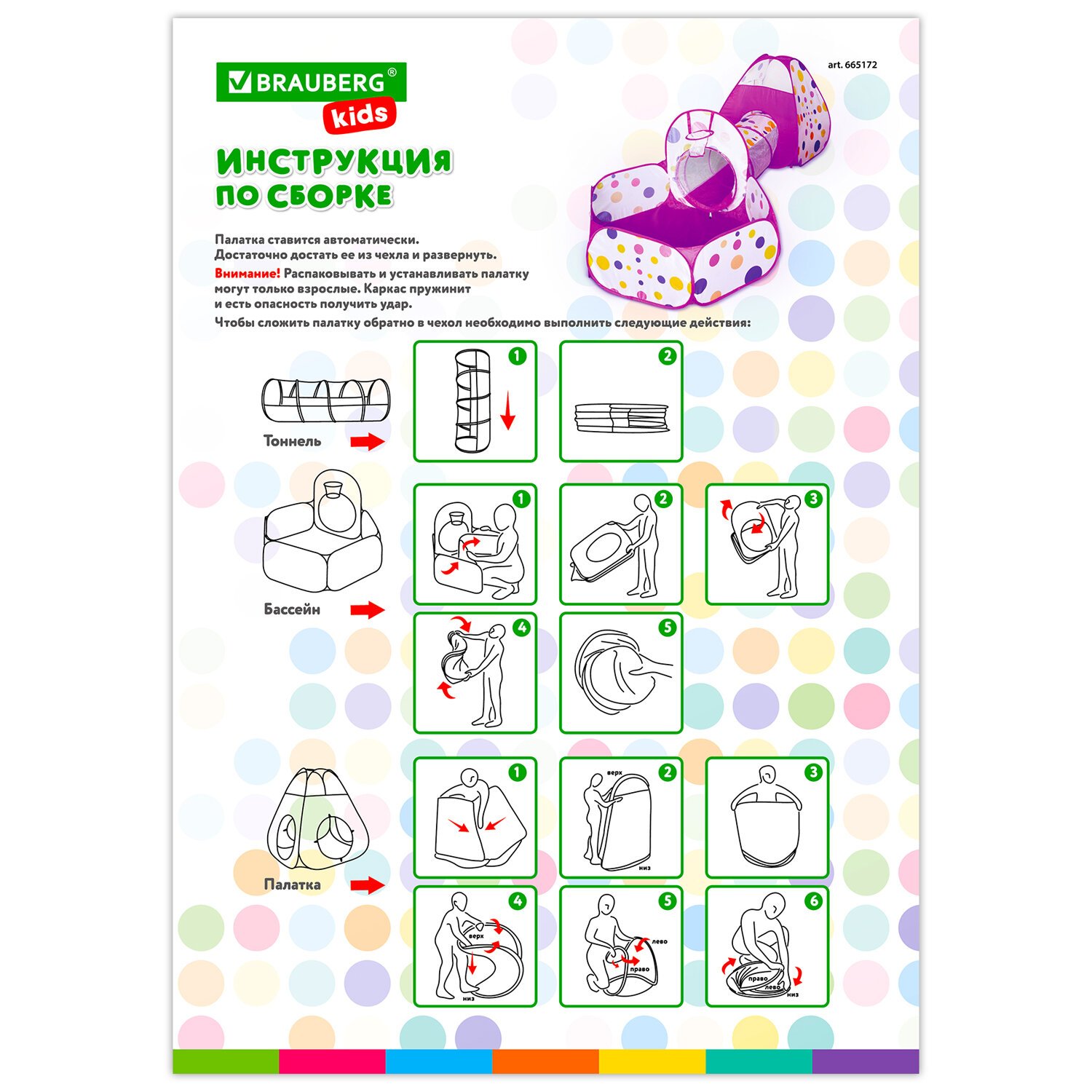 Детская игровая палатка-лабиринт с 2 тоннелями и кубом, 4 в 1, в сумке, BRAUBERG KIDS, 665171