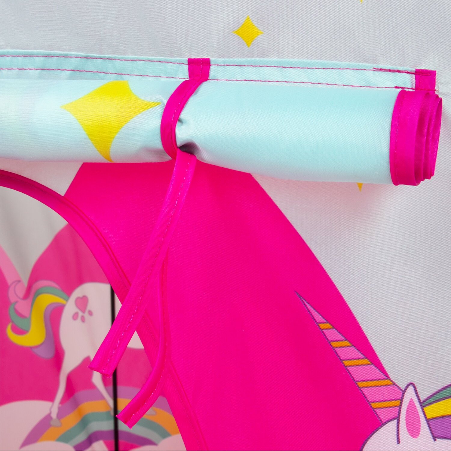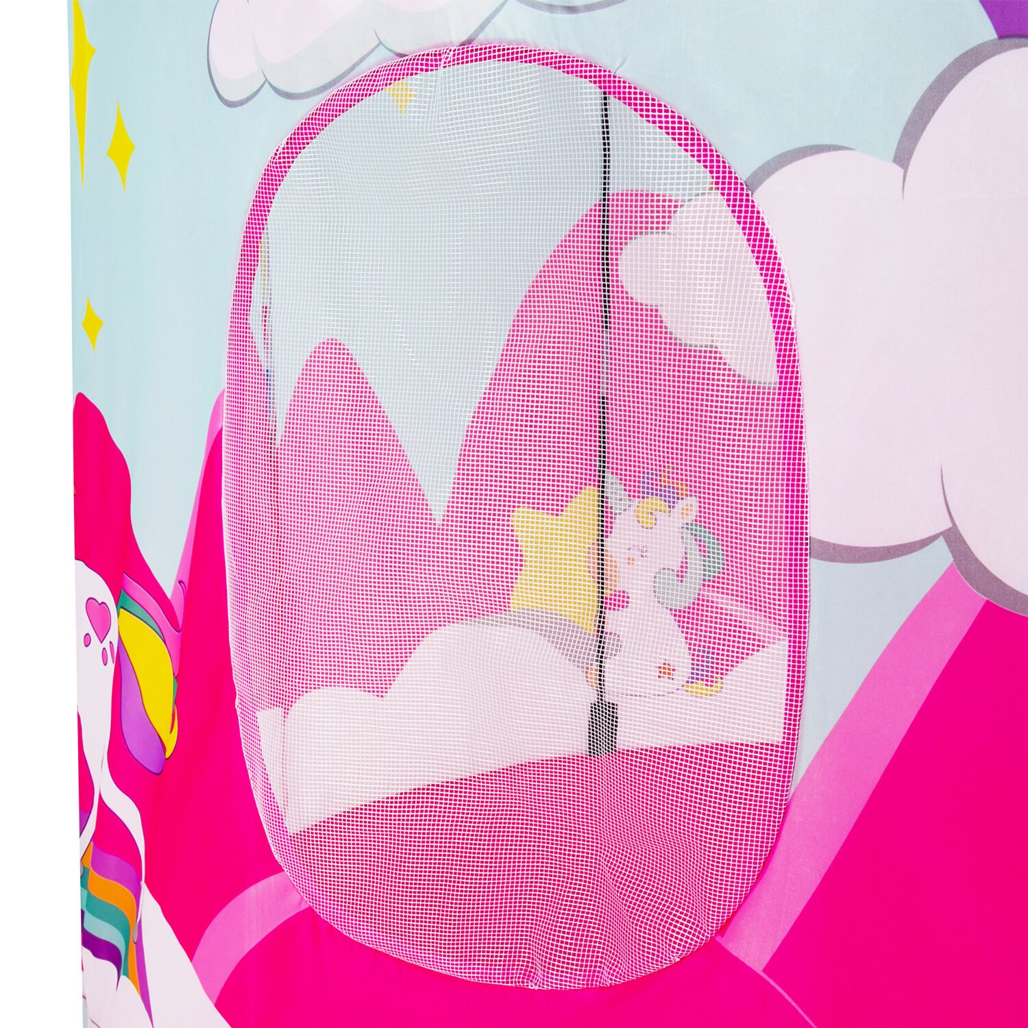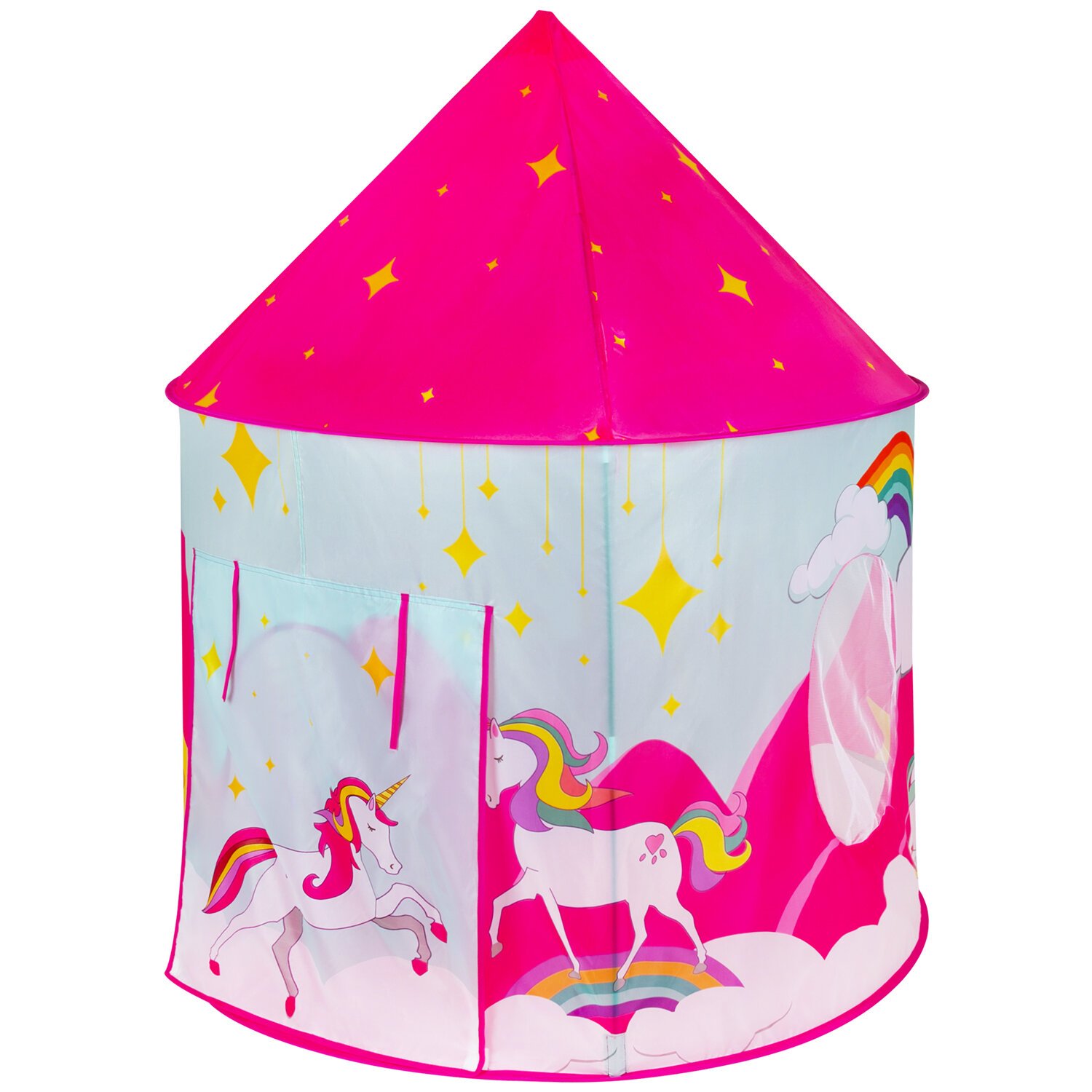 Дверь палатки внизу фиксируется липучками, а при необходимости ее можно поднять, свернуть в рулон в верхней части и зафиксировать завязками. У палатки есть дверь и 1 окно, оснащенное москитной сеткой, поэтому в детском домике всегда будет свежий воздух и защита от насекомых и солнца. На текстильном прочном дне внутри палатки удобно сидеть.