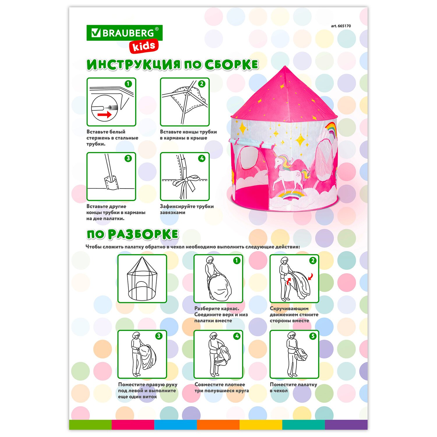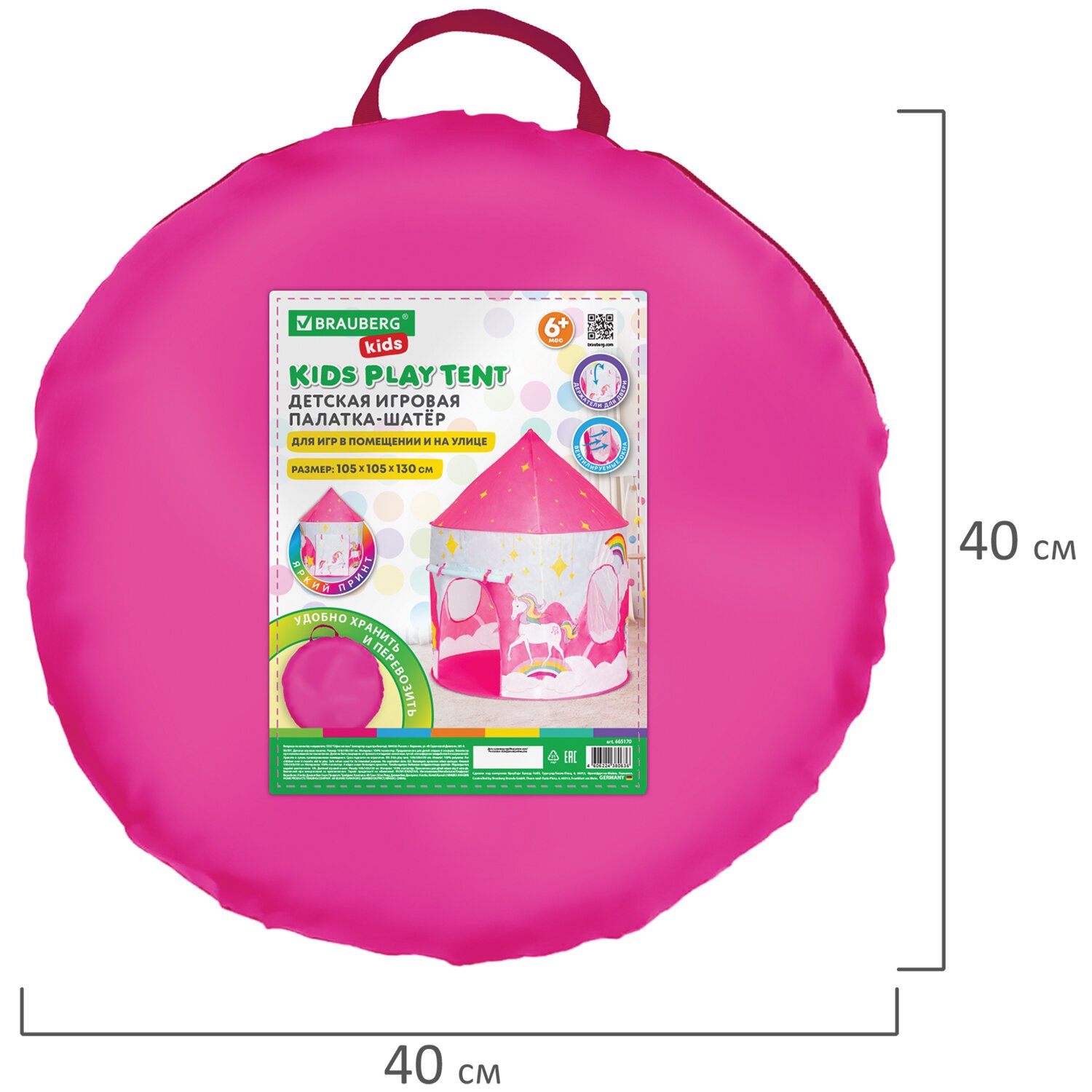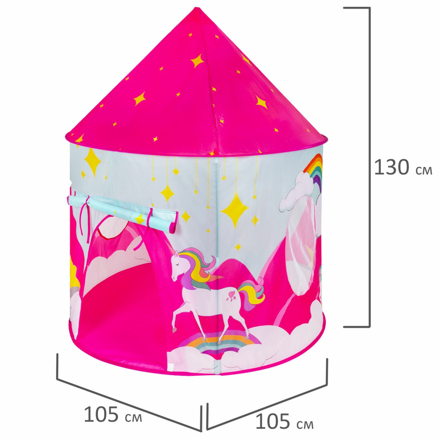 Детская игровая палатка-шатер BRAUBERG KIDS представляет собой дом для ребенка, который помещается в небольшой сумке размером 40х40х4 см. Механизм палатки частично самораскладывающийся, а частично – требующий небольшой ручной сборки, которая не вызовет затруднений. Размеры палатки в собранном виде – 105х105х130 см. Яркий и красочный дизайн в виде домика с единорогом, который уже многие годы привлекает внимание юных принцесс, не останется незамеченным.