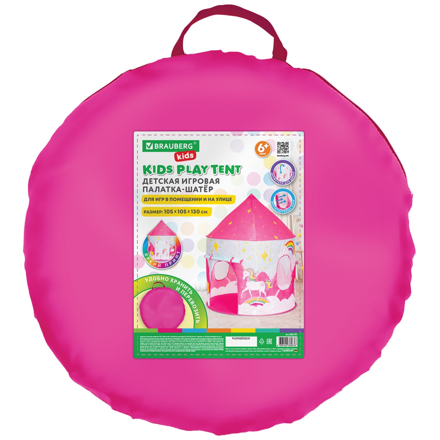 Детская игровая палатка-шатер BRAUBERG KIDS предоставляет детям идеальное индивидуальное пространство для игр, движения, веселья с друзьями, чтения или сна. Она подходит для использования в помещении или на улице.