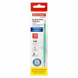 Карандаши чернографитные BRAUBERG НАБОР 12 шт., НВ, с резинкой, пластиковый зеленый корпус, 180678