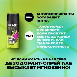Способ применения: встряхните баллон дезодоранта AXE, распыляйте 2-3 секунды на сухую и чистую кожу подмышек с расстояния 15 см от тела.
