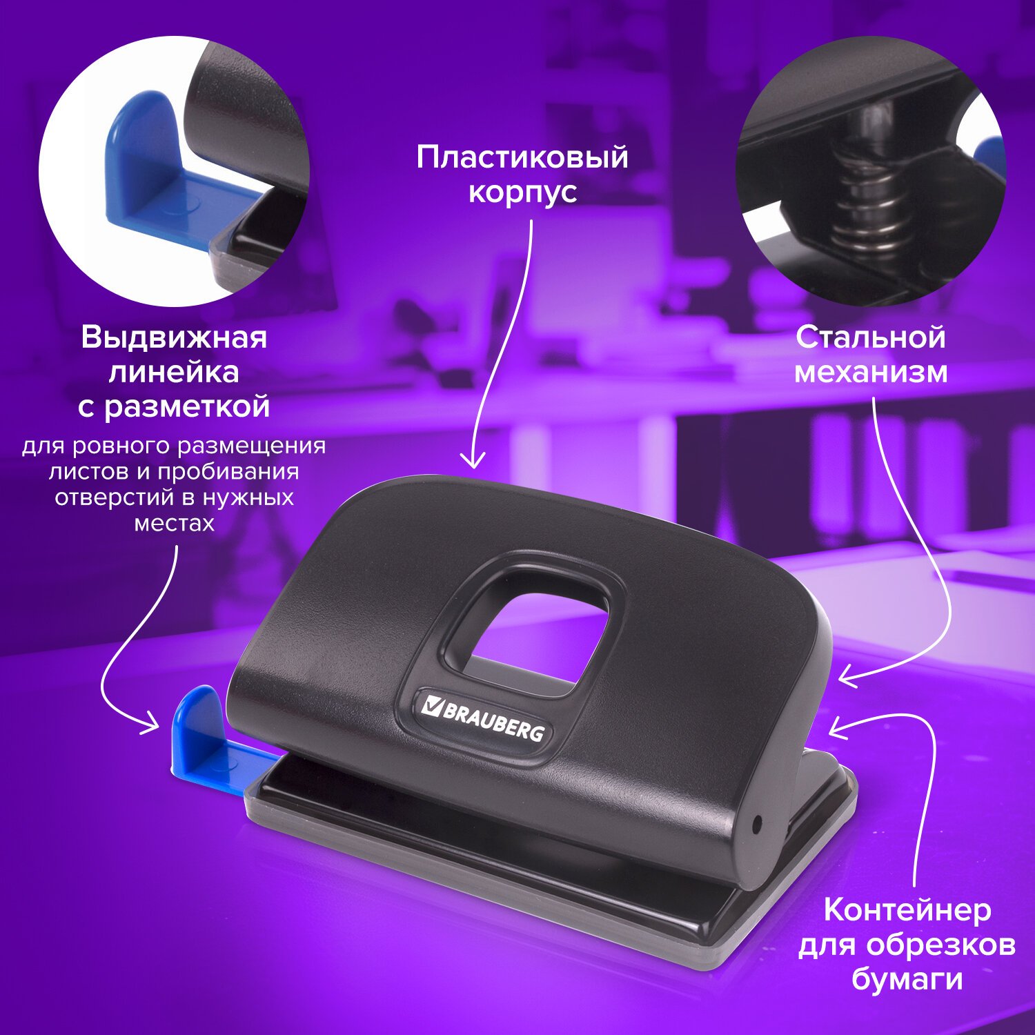 Дырокол BRAUBERG "Extra" – это необходимый офисный предмет, с помощью которого можно аккуратно пробивать отверстия в бумаге и затем подшивать документы в папку.